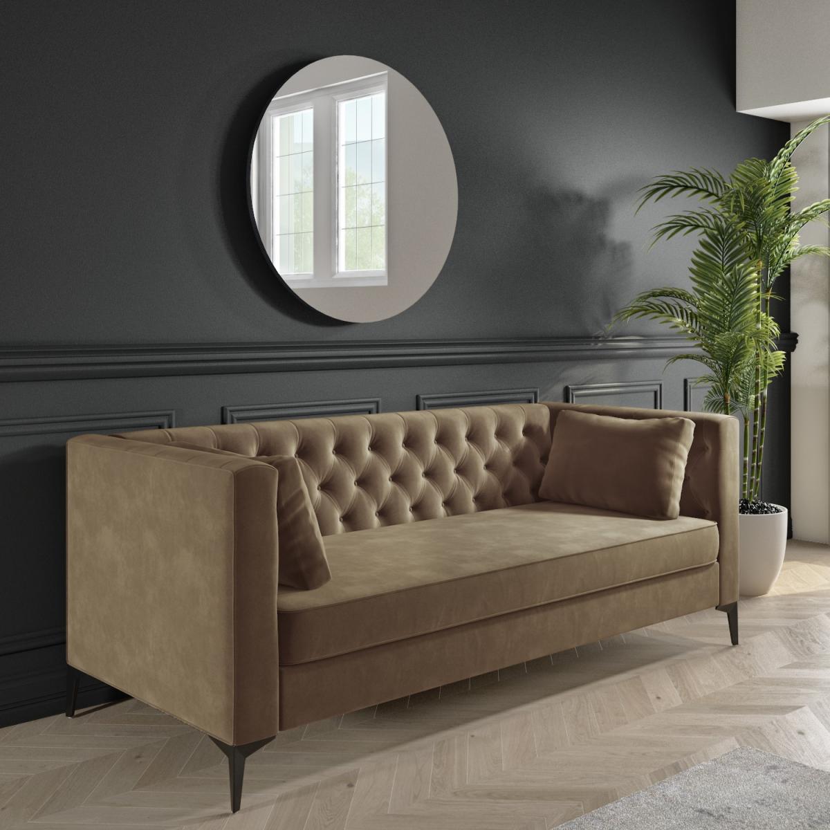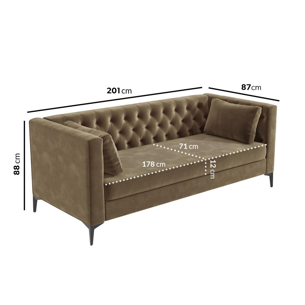 Inspired by mid-century design, this gorgeous Luther sofa offers clean lines to its bold silhouette thanks to the plush mink velvet upholstery; it's guaranteed to make an impact. It'll easily coordinate with other furnishings and décor. The diamond tufted detailing created by its quilted button back adds just the right amount of opulence. Comfortably seating two to three people, there's plenty of room to snuggle, thanks to its deep seating. The tall black metal tapered legs add a final finishing touch. This sofa arrives in 3 boxes therefore assembly is required to fix the bottom of the sofa to the back and the sides.