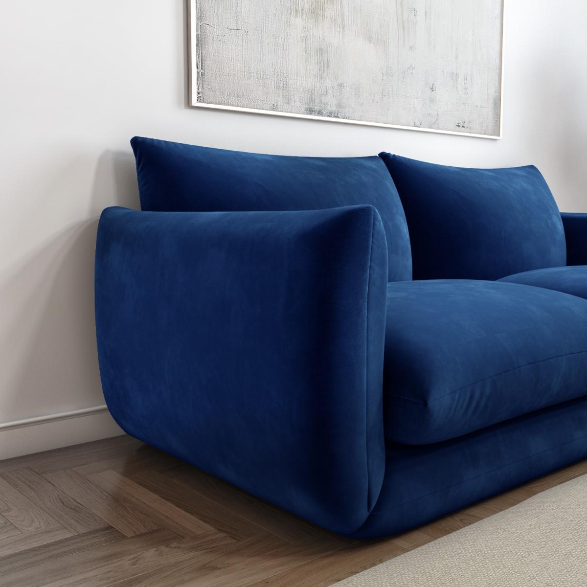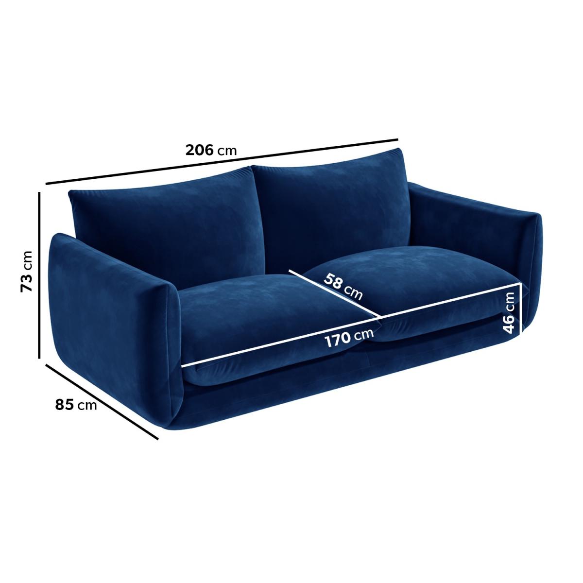 Features we love Navy 3-seater sofa upholstered in a soft velvet Perfect sofa to snuggle up on with big deep cushions. Minimalistic low sofa with a plump curved silhouette. Foam-filled seat and back cushions for added comfort. No assembly required so you can use it straight away. Other colours are available in the Bodi range. Need to know. Dimensions. H73 x W206 x D85 cm Max supported weight. 110kg per seat Weight. 50kg Seats. 3 Colour. Navy Finish. Velvet upholstery Material. Velvet fabric with eucalyptus wood and plywood frame and plastic legs Assembly required. No..
