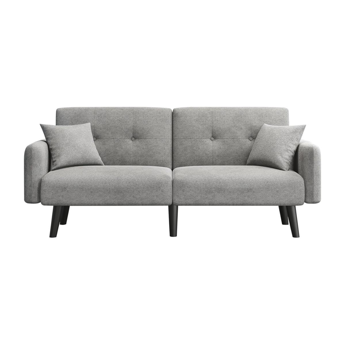 The sofa bed features an adjustable backrest with three angles 105, 135, and 180 degrees allowing for customizable comfort whether sitting or lying down. It is rated 3 out of 5 on the firmness scale, providing a balanced mix of softness and support with high-resilience, recyclable foam cushions. Built with a solid wood frame and supported by six legs, it can hold up to 350 kilograms and is easy to assemble. Its modern design with classic appeal makes it a great fit for living rooms, apartments, offices, or guest rooms. The sofa bed is delivered in two boxes with all necessary parts, including hidden armrests and pillows.