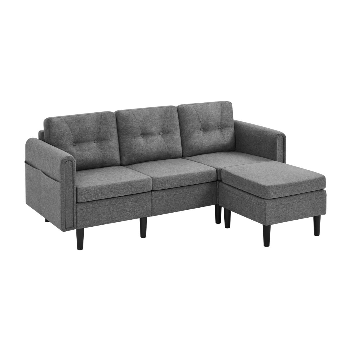 Constructed with a blend of solid and manufactured wood and upholstered in durable fabric, this L-shaped sofa is built to provide years of comfort and relaxation. The ottoman of this corner sofa is detachable, allowing you to create a comfy chaise lounge on either side of the sofa. This small corner sofa include four large side pockets for extra storage space for living essentials, and twelve sturdy legs elevating the sofa 16.5 cm off the ground for robotic cleaners to slip under.