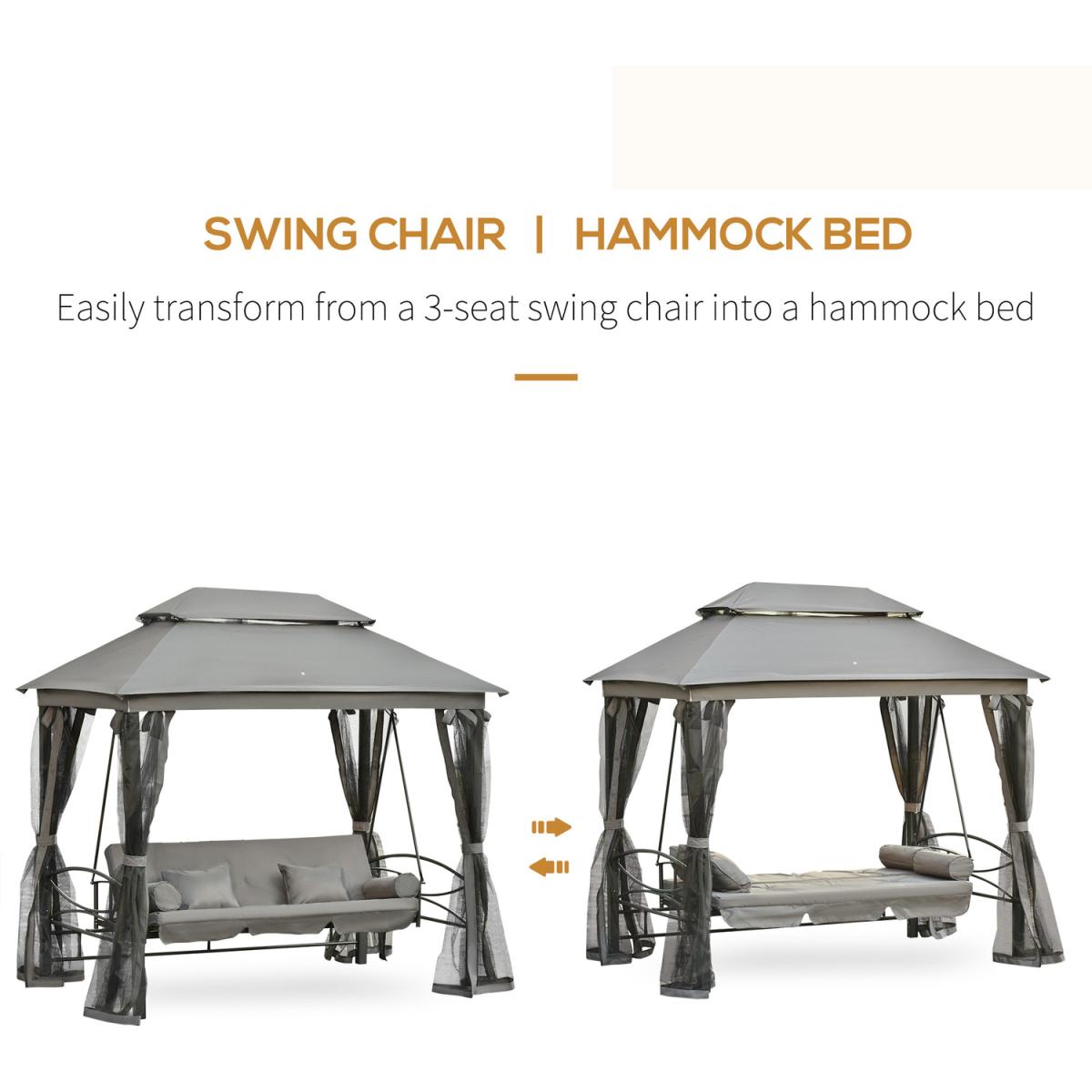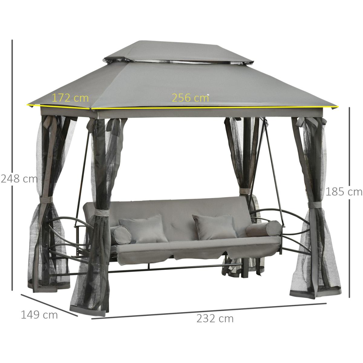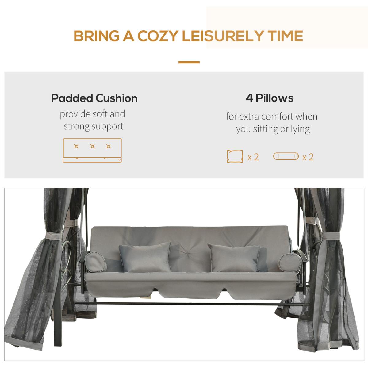 The 3 seaters multi-functional swing chair from Outsunny can be converted to a single bed in seconds. With two 6cm-thick cushions, two soft pillows and two neck rolls included, it offers optimal comfort whether you are sitting or lounging. The 2-tier canopy top features water and wind-resistant, while the removable zippered mesh curtains on all sides protect you against mosquitoes and allow for fluid air circulation. The sturdy steel construction with a 300kg weight capacity allows you to relax on the comfortable swing chair hammock with your loved ones and create the ideal leisure space.