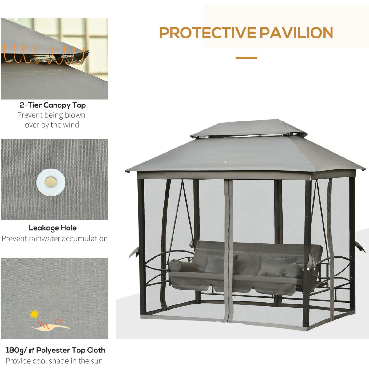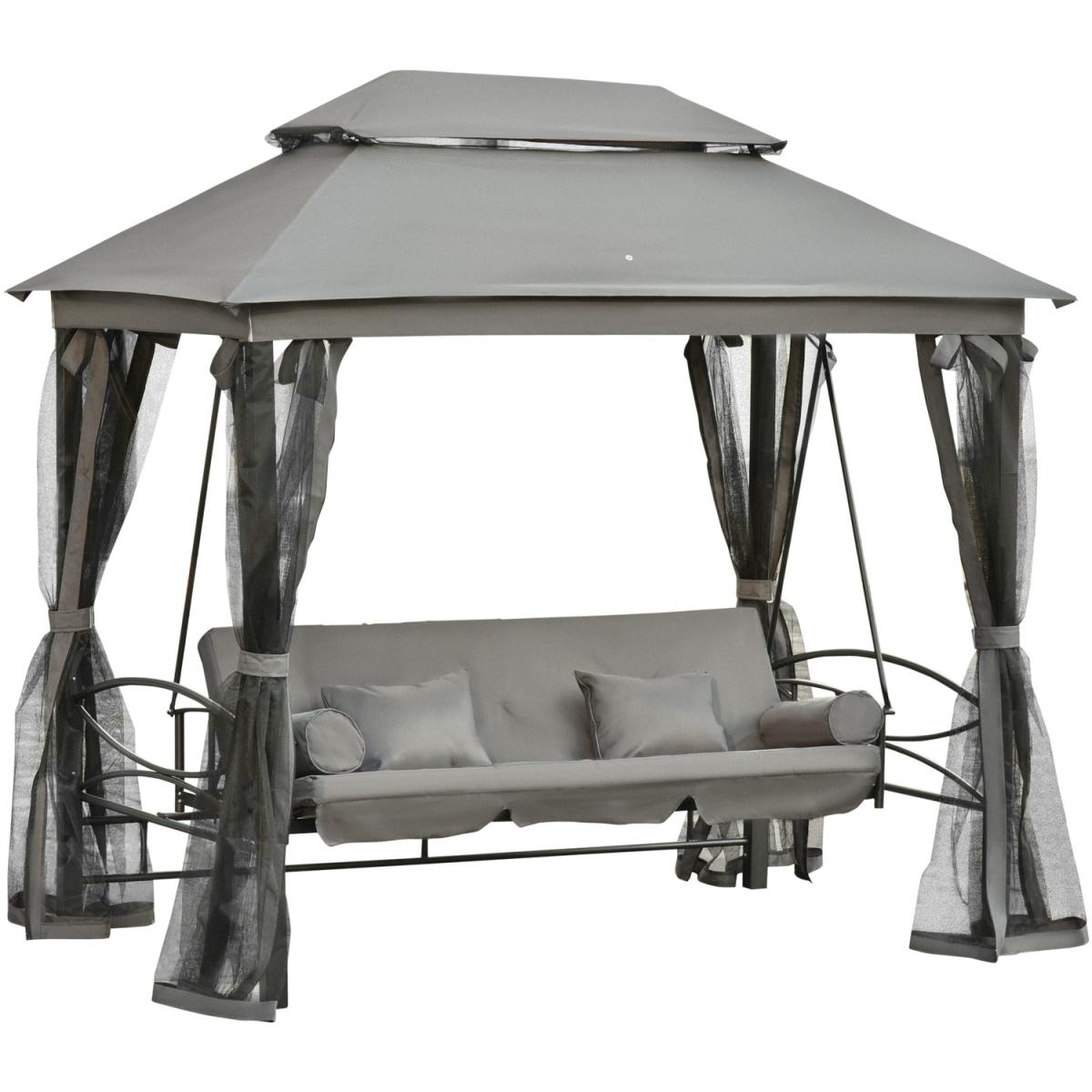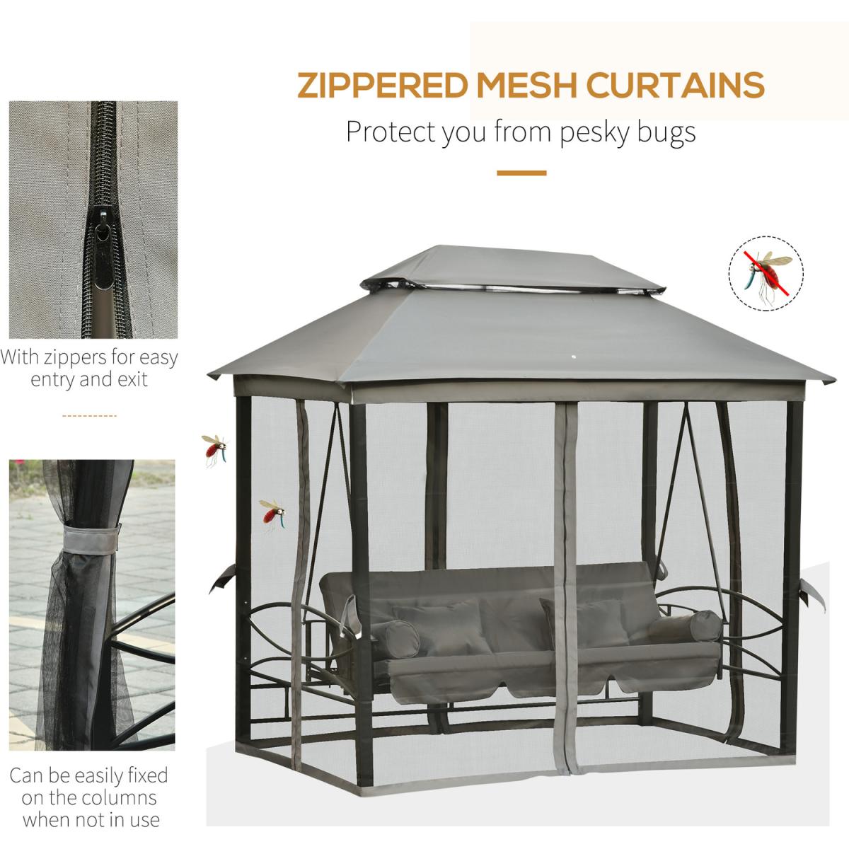 The 3 seaters multi-functional swing chair from Outsunny can be converted to a single bed in seconds. With two 6cm-thick cushions, two soft pillows and two neck rolls included, it offers optimal comfort whether you are sitting or lounging. The 2-tier canopy top features water and wind-resistant, while the removable zippered mesh curtains on all sides protect you against mosquitoes and allow for fluid air circulation. The sturdy steel construction with a 300kg weight capacity allows you to relax on the comfortable swing chair hammock with your loved ones and create the ideal leisure space.