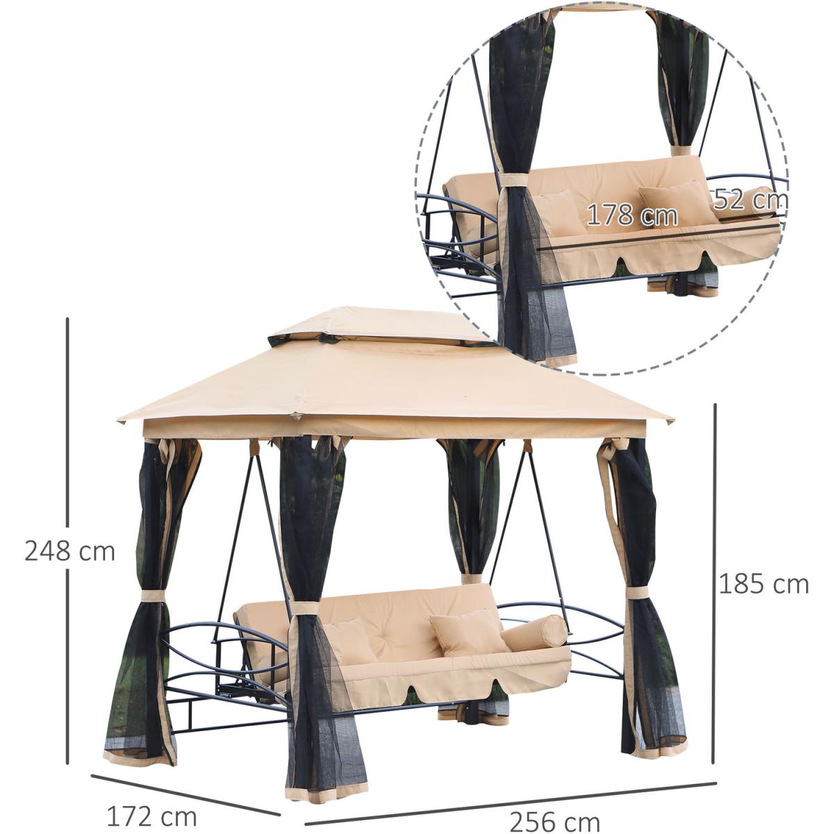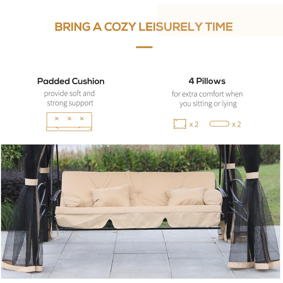 The 3 seater multi-functional swing chair from Outsunny can be converted to a single bed in seconds. With two 6cm-thick cushions, two soft pillows and two neck rolls included, it offers optimal comfort whether you are sitting or lounging. The 2-tier canopy top features water and wind resistance, while the removable zippered mesh curtains on all sides protect you against mosquitoes and allow for fluid air circulation. The sturdy steel construction with a 340kg weight capacity allows you to relax on the comfortable swing chair hammock with your loved ones and create the ideal leisure space.