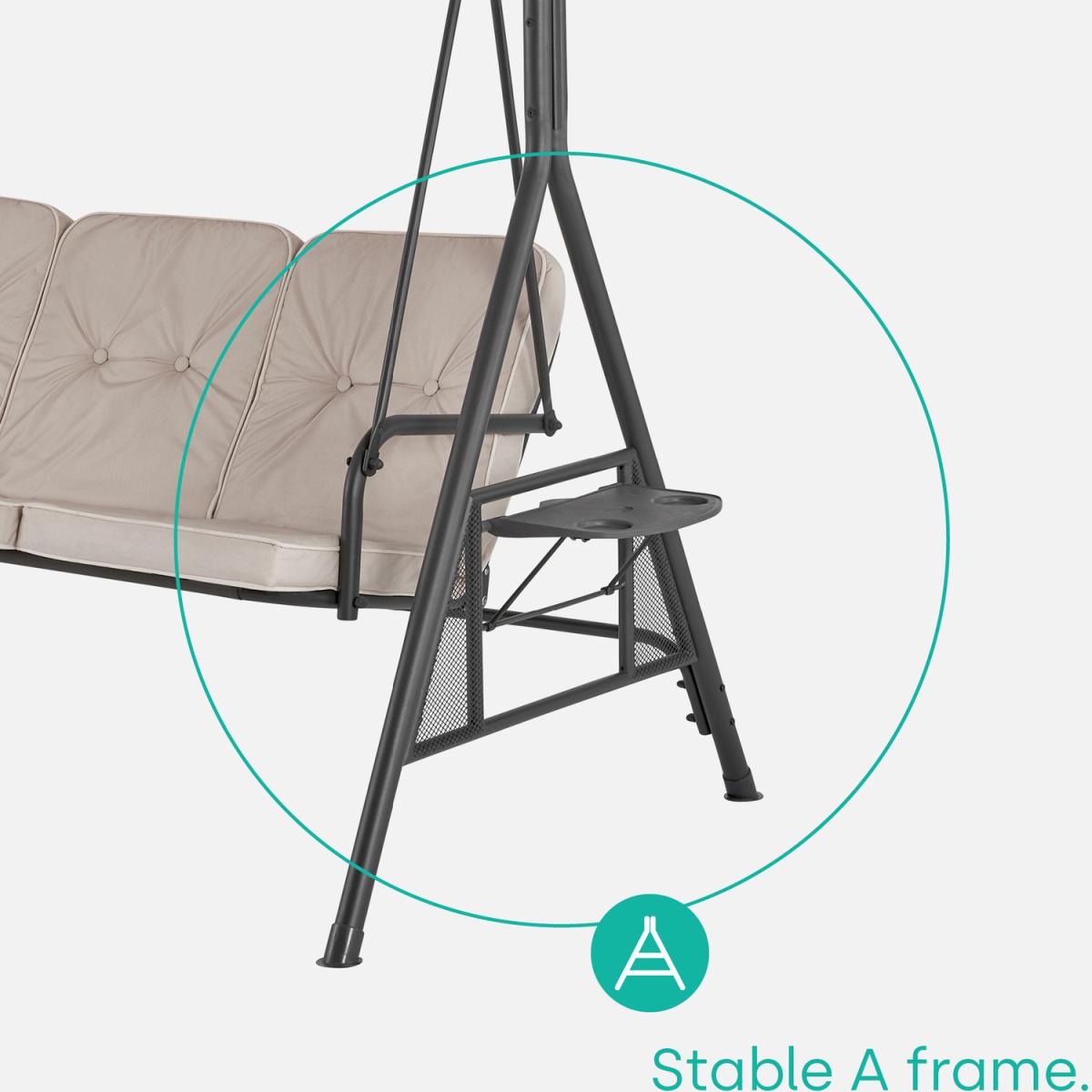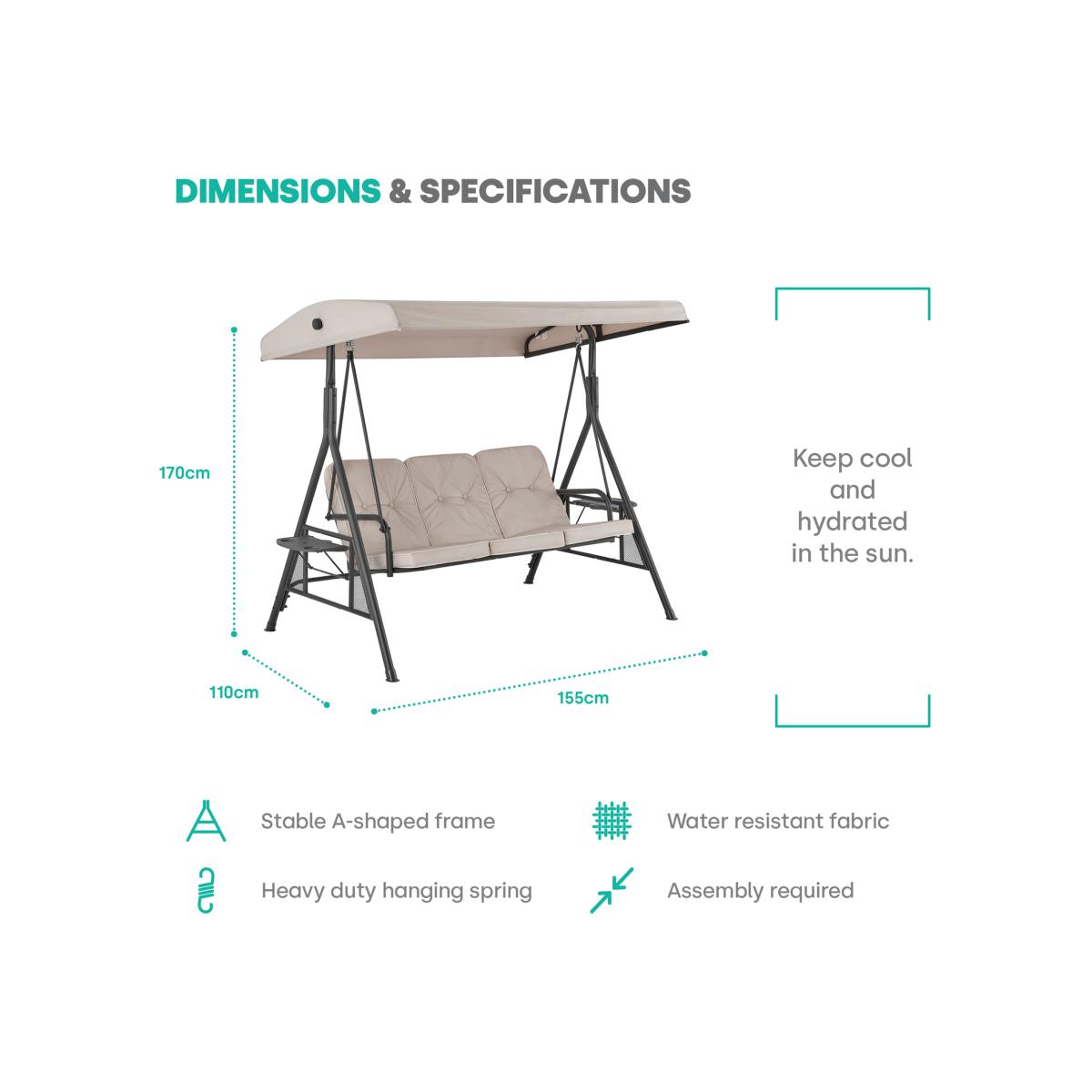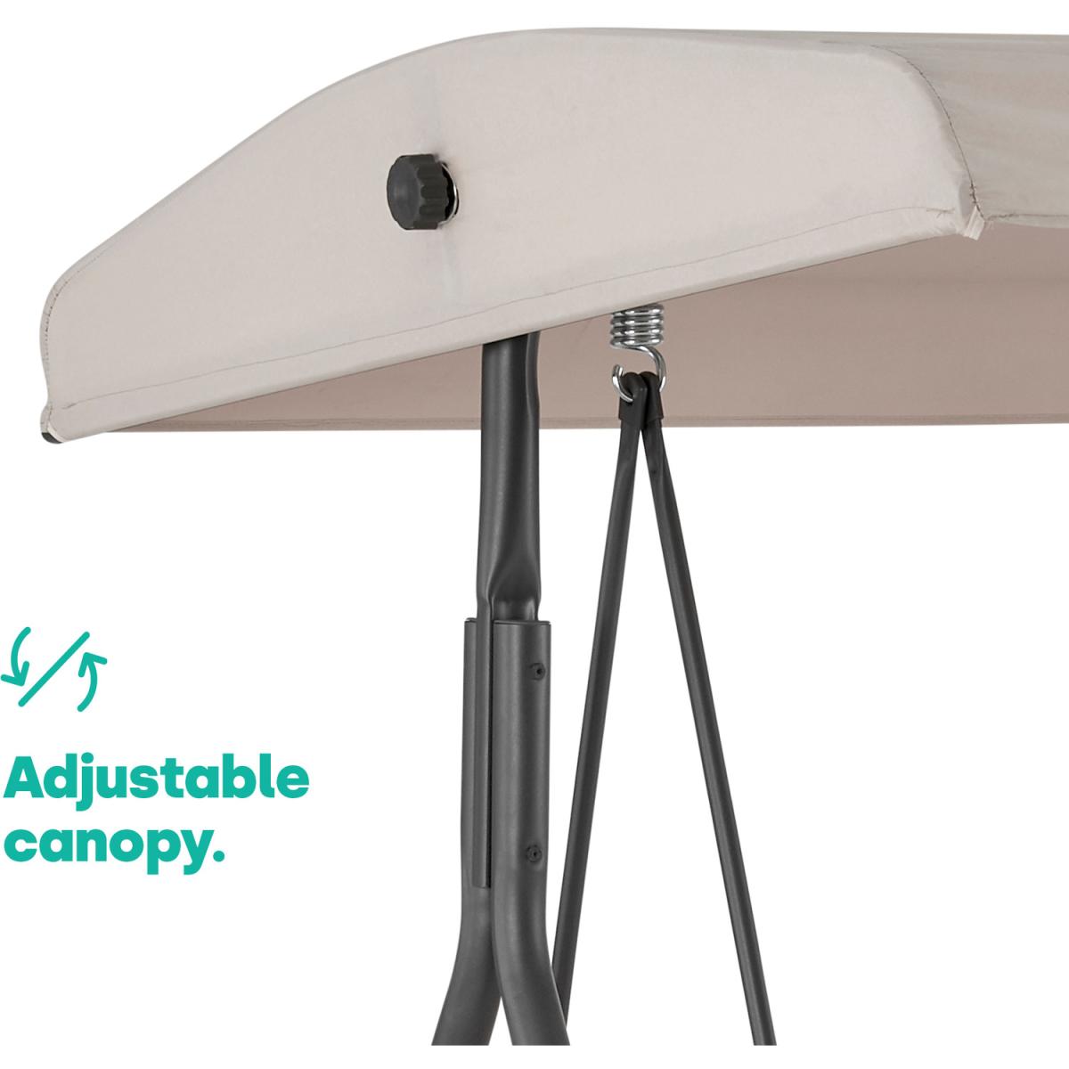 Switch off, sit back, and engulf yourself in the LIVIVO Florence 3-seater swing chair. The remarkable chair provides the perfect experience to live in luxury and gives you the well-deserved break needed. The soft padded cushions provide comfort to make you feel relaxed and enjoy your time on the swing chair. The extra room allows you to sit closely with friends and family and something for the kids to enjoy. The LIVIVO swing chair features a sleek powder-coated steel frame and robust fabric. The contemporary design is a statement piece within the home or garden. The chair comes with a canopy which provides direct shade from the sun, and offers protection from light showers while promoting air flow from all angles. During the cold seasons, you can place the chair indoors and snuggle into the warmth and comfort provided by the plush cushions.
