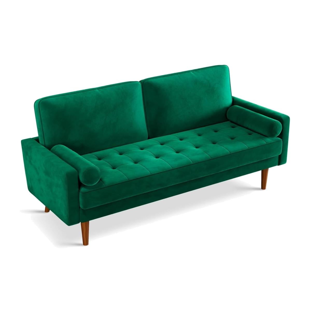 Squared armrest and smooth velvet construction delivers a clean simple look. Detail pillows bring a little personality. Fit 2-3 people, compact and comfortably. Stain-resistant velvet fabric. Easy floor-cleaning. Fits for small spaces, dorm, apartment, studio, home office, etc. Support weight up to 320 kg. 10-minute easy assembly install. All accessories have been packed in the box, If some parts are missing, please contact with us in time. Our cushions are neither too soft nor too firm. On a scale from 1 to 5 (5 being firmest), it is a 3. Green Velvet Sofa, Mid Century Modern 3 Seater Couches w Square Armrest, Button Tufted Seat Cushion, 2 Pillows, Comfy Small Sofas for Living Room, Bedroom, Apartment, Home Office