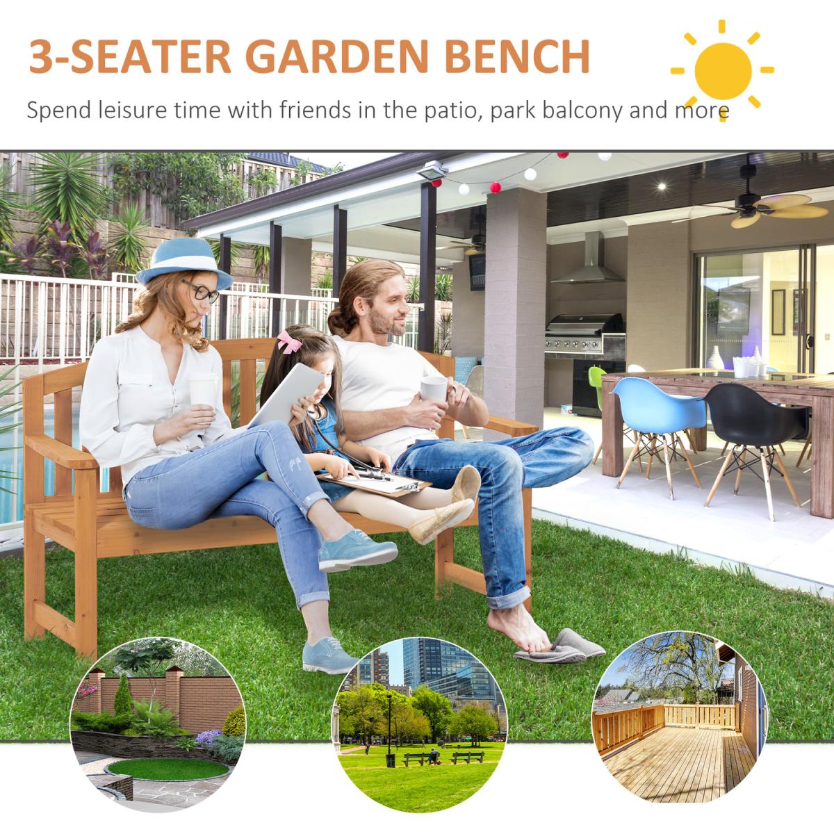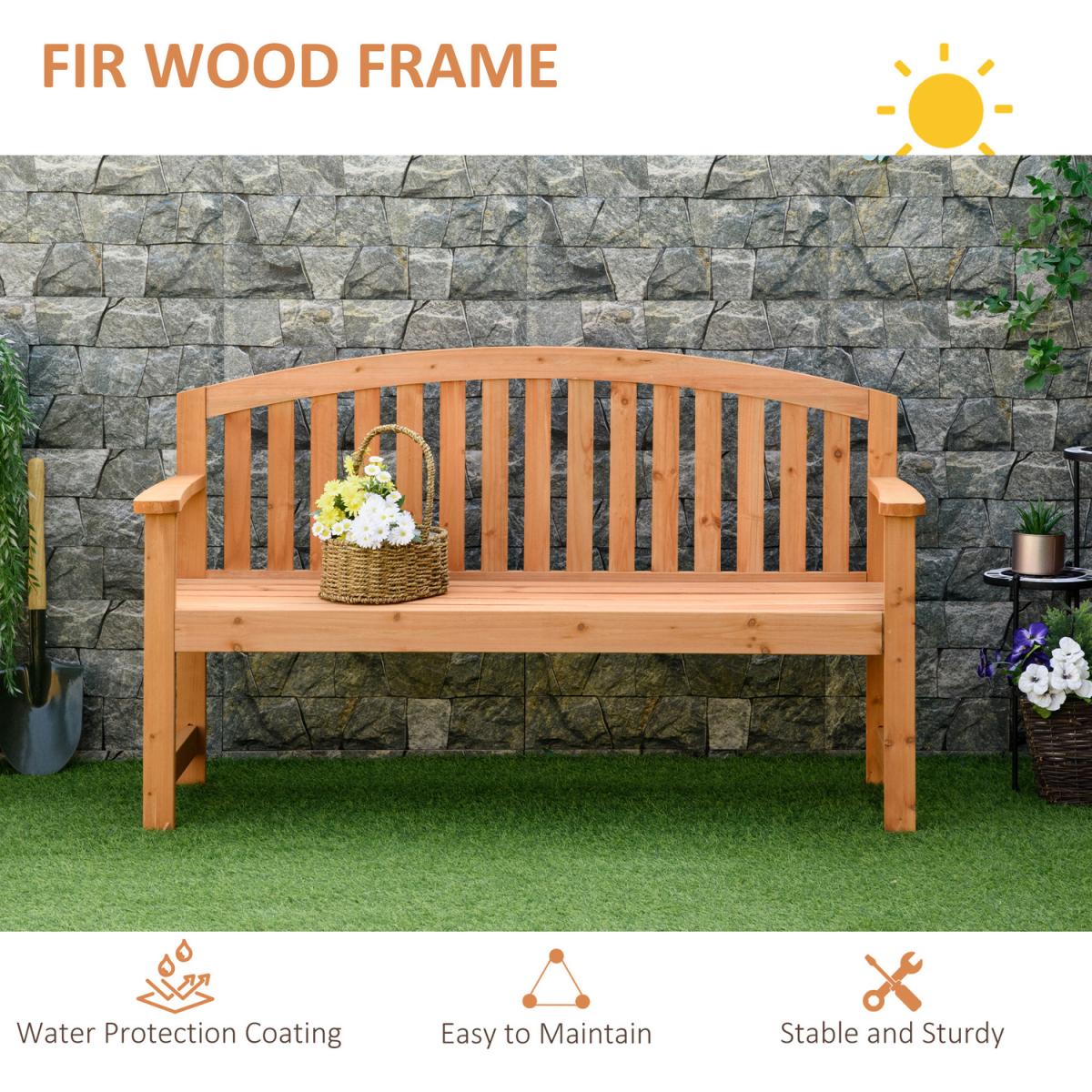Bring understated beauty into your garden with this natural wood bench, from Outsunny. Using solid fir wood, it is crafted into a spacious three-seater design, ensuring there is plenty of room for you to sit and chat comfortably with two friends, whether that's in your garden, patio, balcony and other private outdoor spots. The slatted back and seat prevents water building up, with a tall back and fixed armrests for comfortable support and comfort. Finished with a lick of protective varnish.