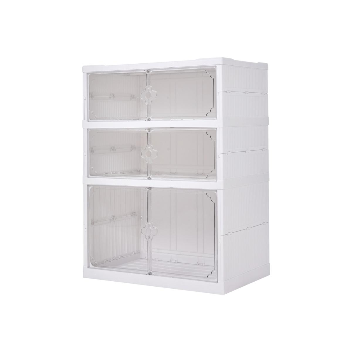 Keep your footwear organized and your living space tidy with this versatile 3-tier foldable shoe rack. Designed to accommodate multiple pairs of shoes, its double-row configuration maximizes storage capacity. The clear door panels allow for easy identification of your footwear collection at a glance. When not in use, the rack conveniently folds away, saving valuable space. Its lightweight design ensures effortless mobility, making it suitable for various rooms such as bedrooms, living rooms, or hallways.