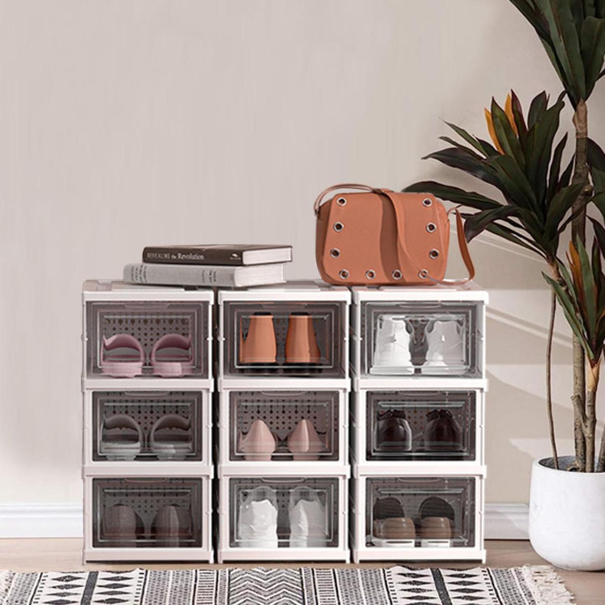 The Livingandhome shoe storage box is crafted from durable plastic, offering a strong and stable structure with a powerful weight capacity. Its vertical and stackable design maximizes space-saving potential. Ventilation slots at the back ensure clean and fresh-smelling shoes. The transparent design allows easy viewing without opening the box. Stay organized and keep your shoes in top shape with this user-friendly storage solution.