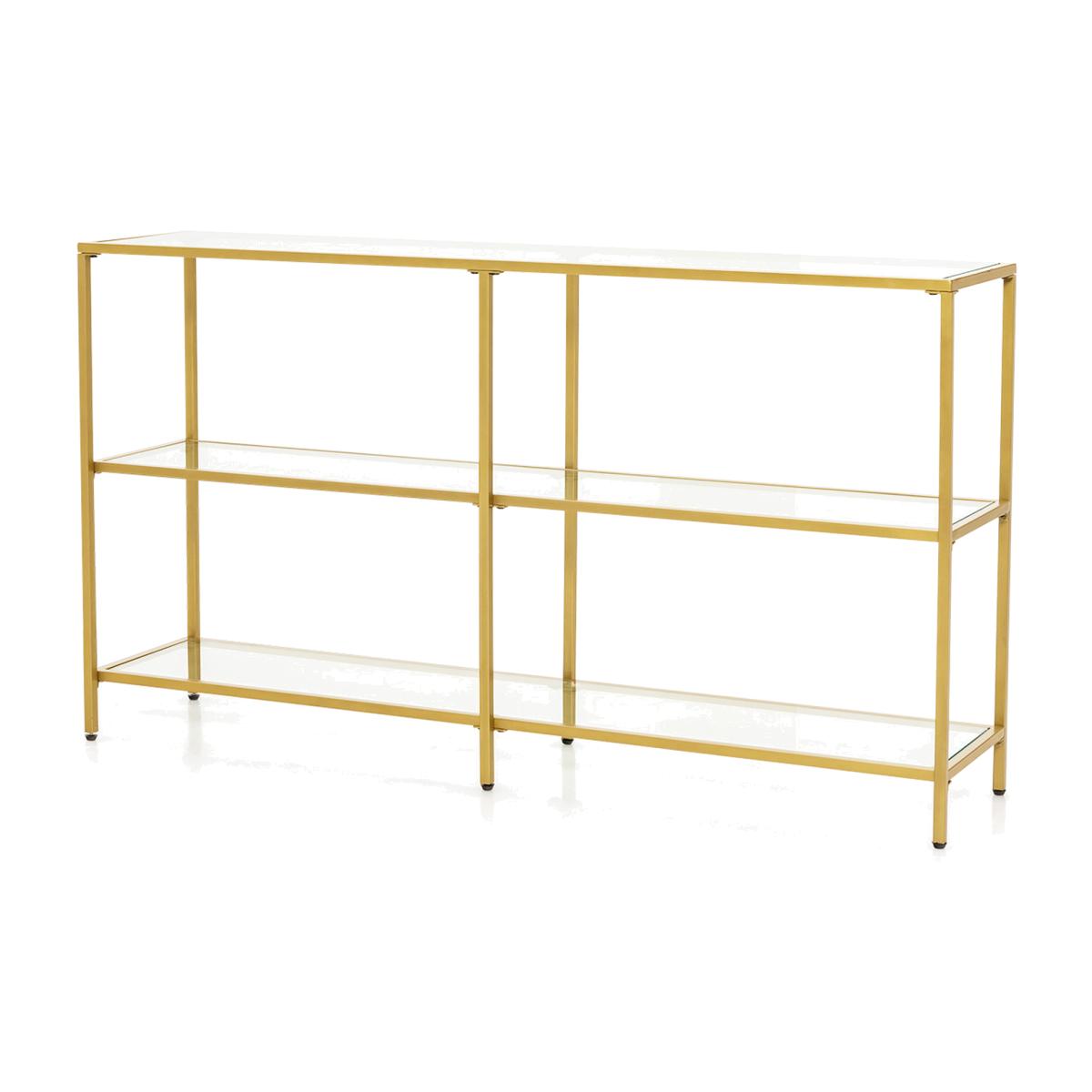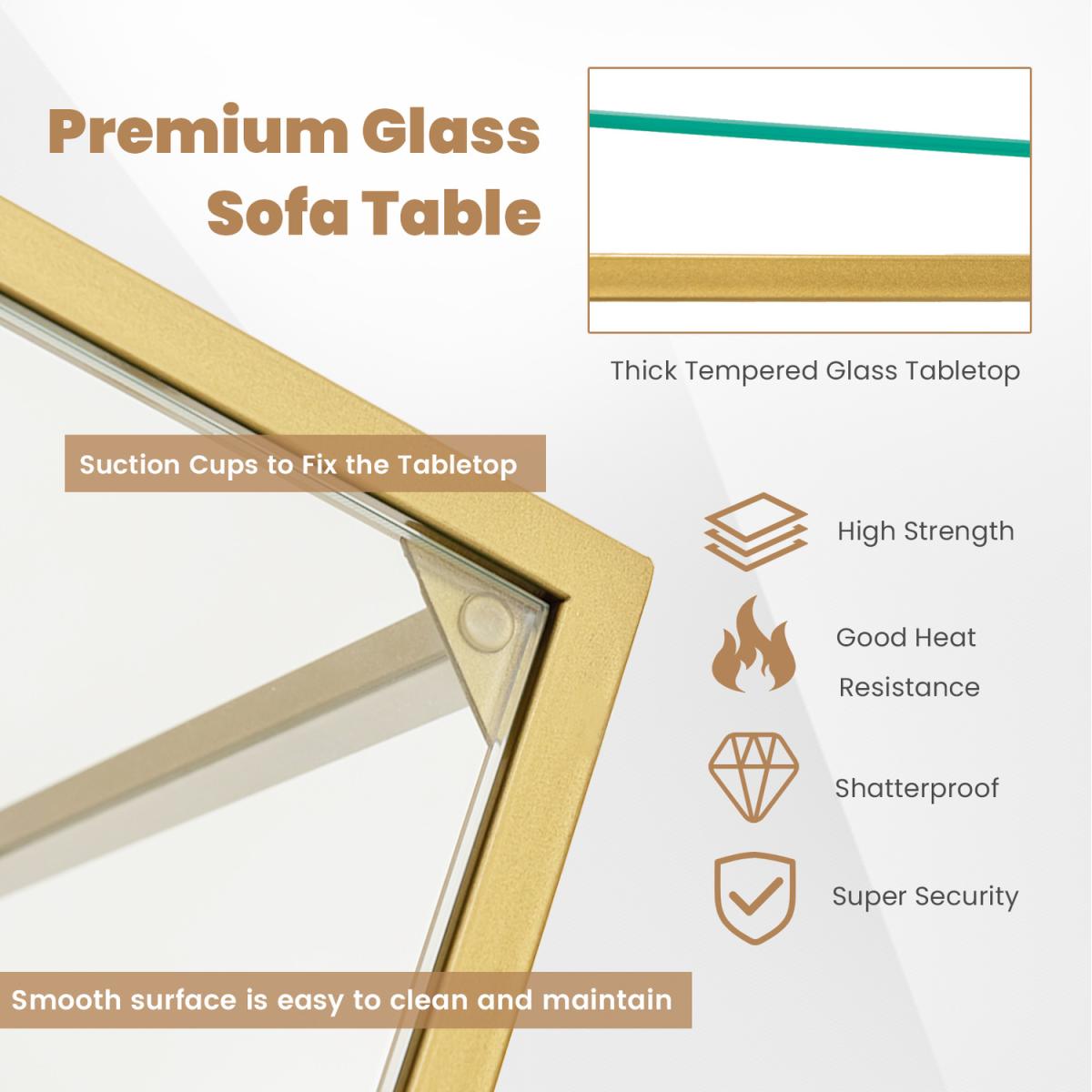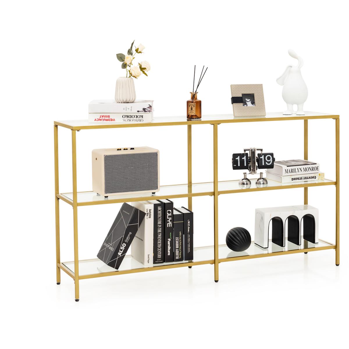 Our glass console table will undoubtedly be a perfect addition to your home! Solid tempered glass tabletop features good heat resistance, is blast-proof, and has high strength. Plus, a sturdy steel frame is not easy to crack or deform. 3 tier shelf provides ample storage space for daily items and keeps everything you need with reach, which is fixed by suckers for higher stability. The combination of transparent tabletop and gold steel frame adds a refined sensation to your home. Meanwhile, this stylish console table perfectly matches well with other furniture and applies to any corner of your home, such as the living room and hallway.