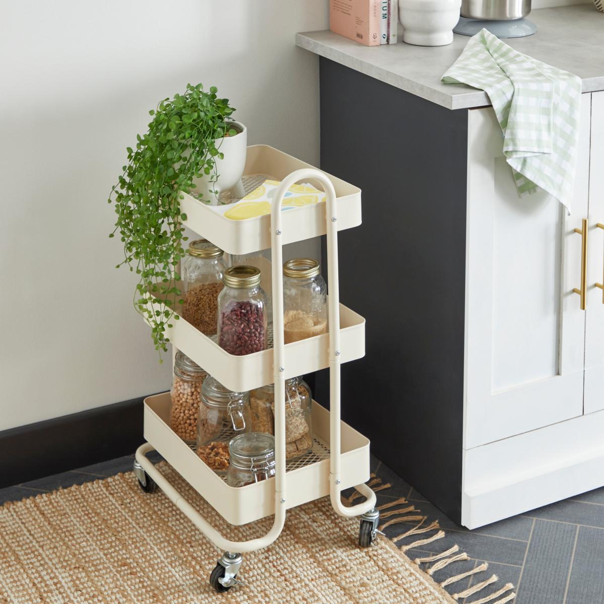 I love this three-tier metal trolley because of its sleek, functional design that adds a touch of practicality to any space. It works particularly well in contemporary or industrial interiors, where its clean lines and metallic finish complement minimalist aesthetics. It’s ideal for organising kitchen essentials, bar accessories, or even as a stylish way to store cleaning supplies or linen near the laundry area. For practical styling, consider adding colourful jars or displaying stylish drinksware on the tiers to create a standout feature, or keep it pared back for a modern, clutter-free look. Its mobility makes it perfect for flexible use around the home, whether for entertaining or everyday storage.