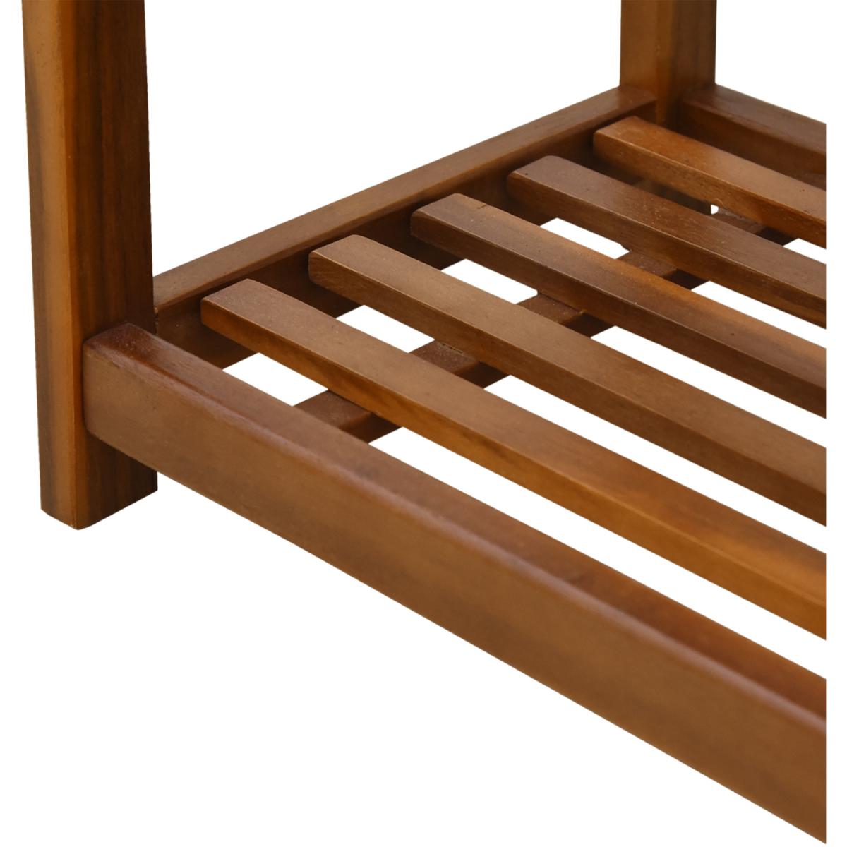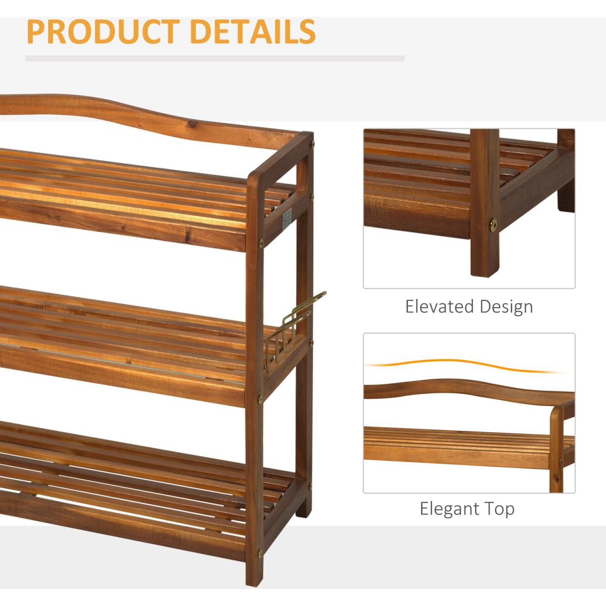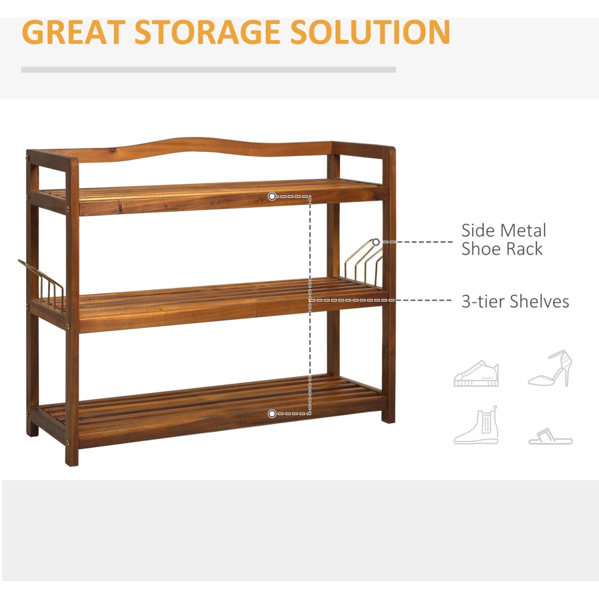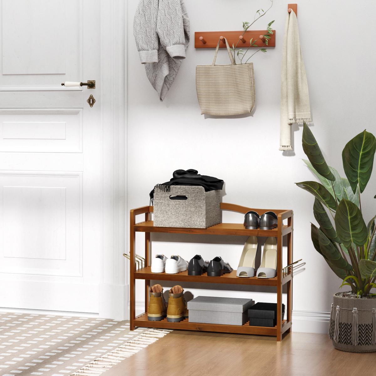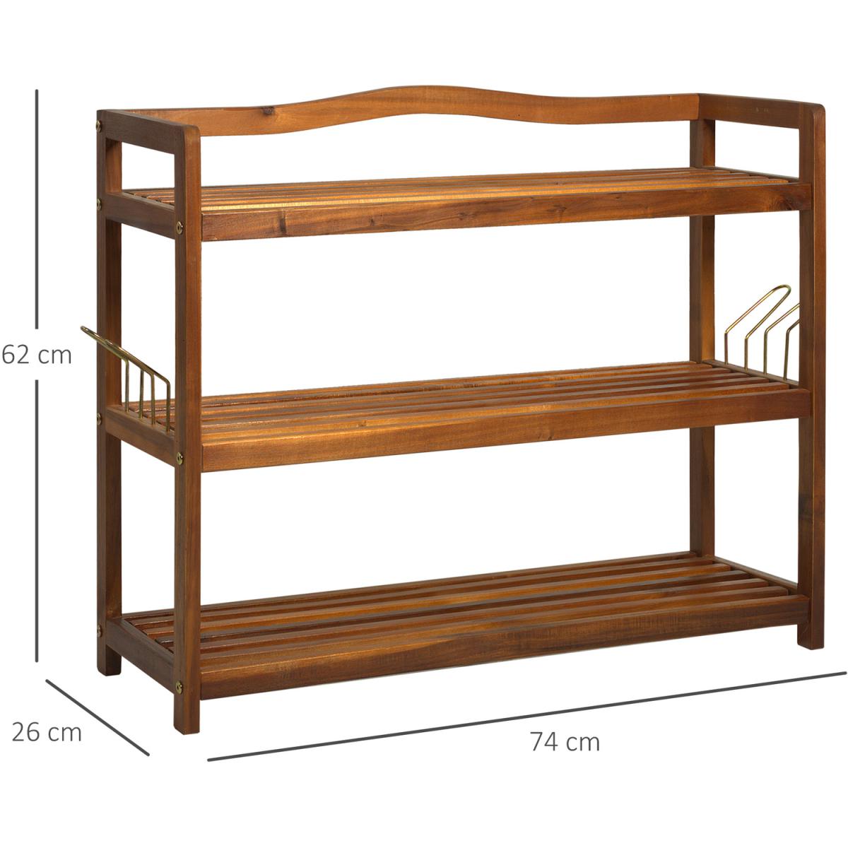 This wooden shoe rack by HOMCOM is a great solution for organising and storing your footwear. Made from Acacia wood, it's really durable and sturdy, coated with warn-tone varnish for an important layer of protection. Three tiers hold up to 12 pairs of shoes - pumps, trainers, smart work style pieces and low-rise boots, with side hooks to hold two more - great for use in the family home. It's complete with a side and back bar so shoes on the top don't fall off.