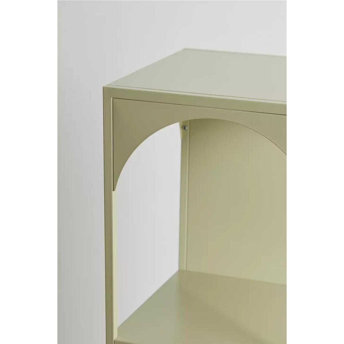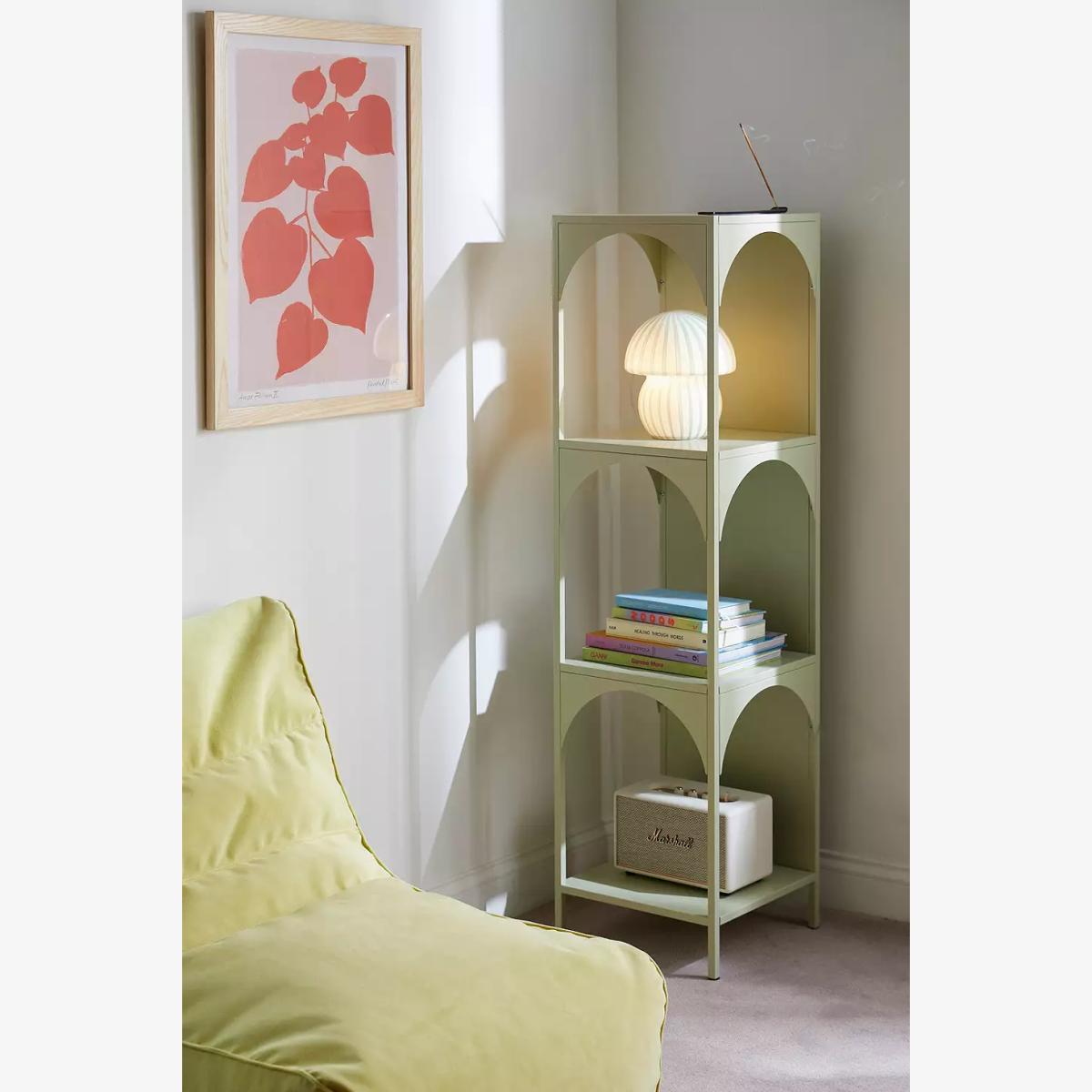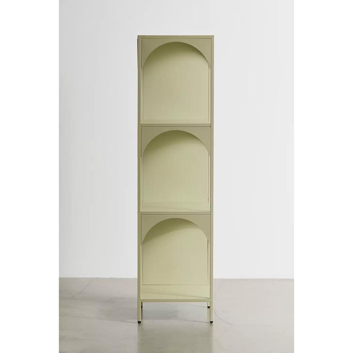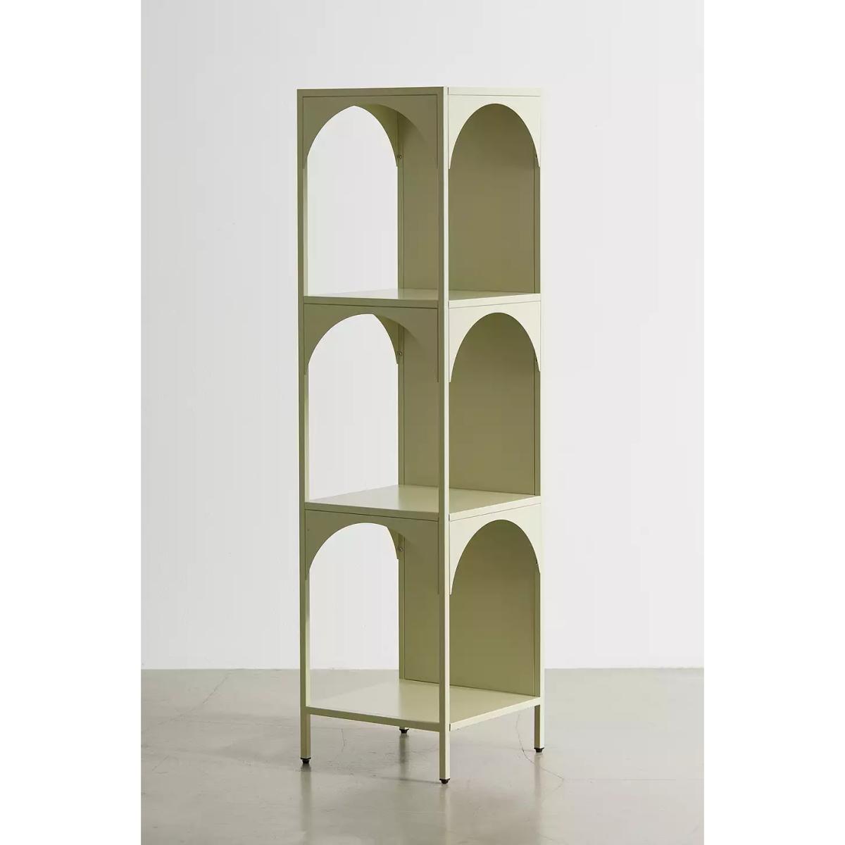 Refresh your storage essentials with this tiered storage shelf crafted from metal. Complete with a statement colour finish, this unit features a trio of tiers in a modern cubic silhouette with arch detailing framing each shelf. The modern storage shelf is perfect for storing your books, displaying your plants and showcasing your trinkets. **Content + Care** \- Iron \- Wipe clean **Size** \- Dimensions: L: 35.1cm x W: 35.1cm x H: 133.1cm \- Leg height: 8.89 \- Shelf dimensions: L: 35.1cm x W: 33cm \- Space between shelves: 35.71cm \- Weight limit: 11 lbs \- Weight: 16.5 lbs \- Shipping package dimensions: L: 43.2cm x W: 10.2cm x H: 142cm \- Shipping package weight: 18.7 lbs
