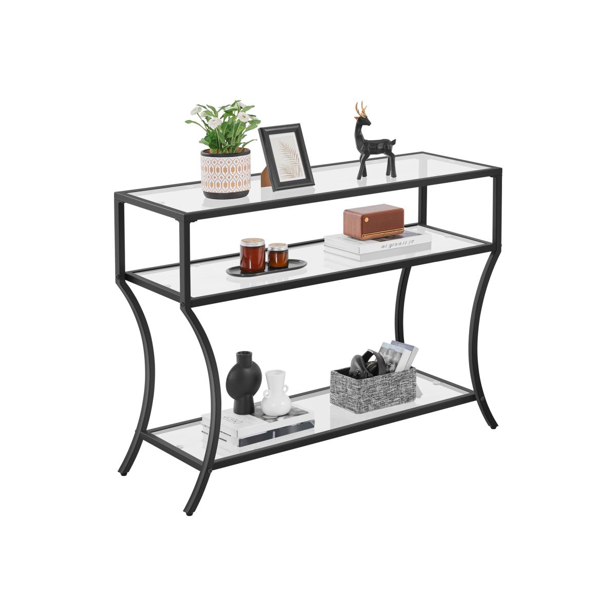 If youre looking for a tasteful console table for your space but getting lost in the various styles and materials, let this minimal tempered glass console table be your smart solution. This 106 cm console table, crafted from strong tempered glass and a protective powder-coated matte iron frame, has excellent durability, stability, and weight capacity. The 3-layer structure accommodates your daily clutter or serves as a crystal collection displaying rack for your vintage lamp, fragrant candles, silver sets, frames, books with well-designed covers, etc.With a clean-lined outline, classic black frame, and crystal clear top and shelves, this 3-layer console table can easily integrate into your room to serve as a practical and tasteful complement.