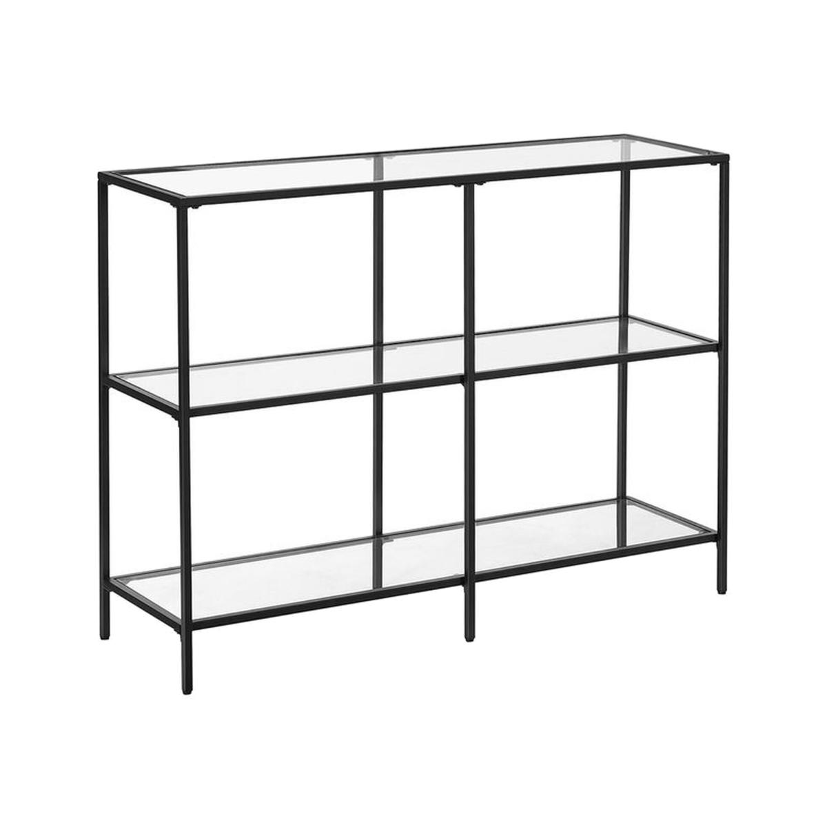 This console table with transparent tempered glass shelves and a black steel frame offers a sleek way to display plants, books, and decorative pieces. Measuring 30 x 100 x 73cm, this compact table fits perfectly in a hallway, behind a sofa, or under a staircase without taking up too much space. Cleaning Built with 5mm tempered glass and a sturdy steel frame, this table supports up to 30kg. Its smooth surface is easy to clean with a simple wipe. Adjustable feet ensure stability, the anti-tip kit enhances safety, and buffer pads reduce noise for a secure and quiet setup. Clear instructions and numbered parts make assembling this console table quick and effortless.