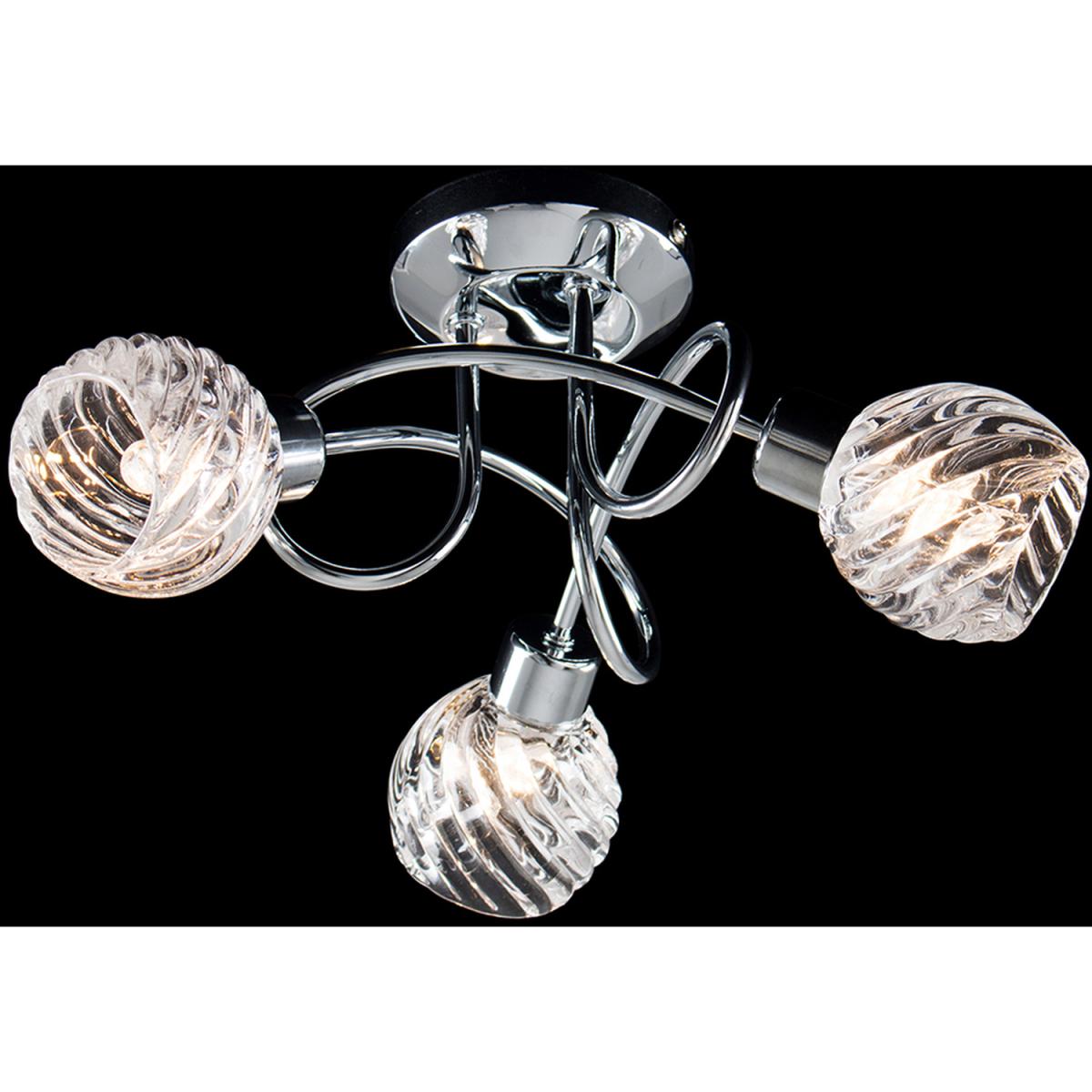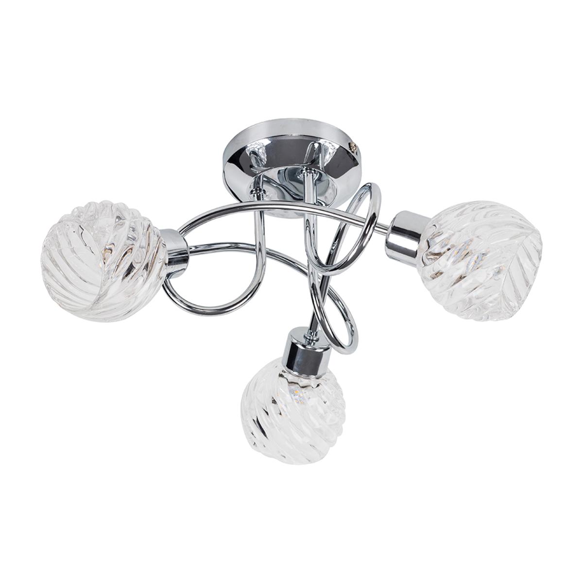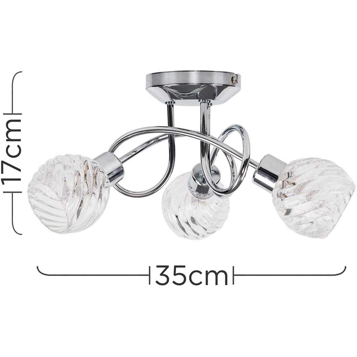 Modern 3 way flush ceiling light fitting, with a curved arm design and polished chrome finish. Complete with swirl clear glass dome shades. Ideal for living rooms, dining rooms, bedrooms and hallways, this flush ceiling light would like perfect throughout the home.