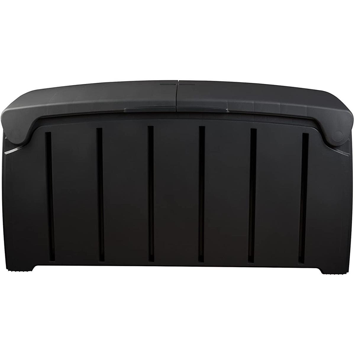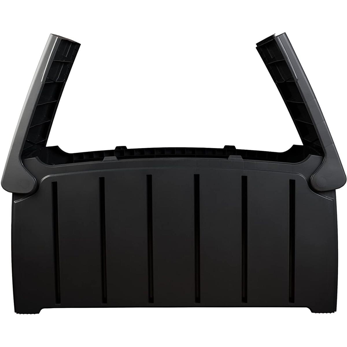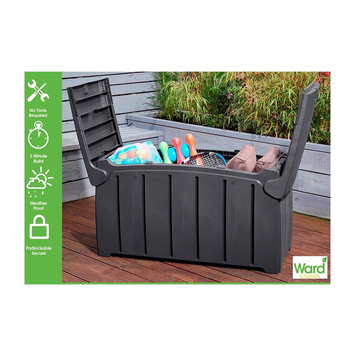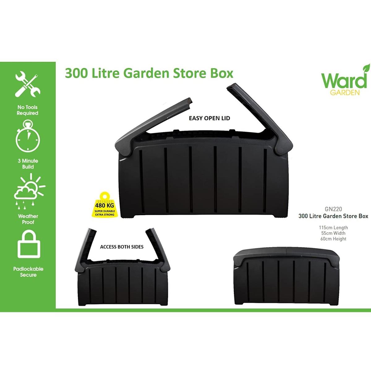 Large 300 litre black outdoor waterproof storage box. Quick and easy to assemble with no tools required. Simple instructions with each piece clicking into place, No tools required. Robust and durable, suitable to store garden furniture, cushions, tools, toys and games. Waterproof container for all year round use with channels directing rain away from opening. The lid has a unique butterfly opening action allowing the store to be placed neatly against a wall. Manufactured with a robust lid suitable to sit on. Designed with a central ring suitable for a padlock (not included).