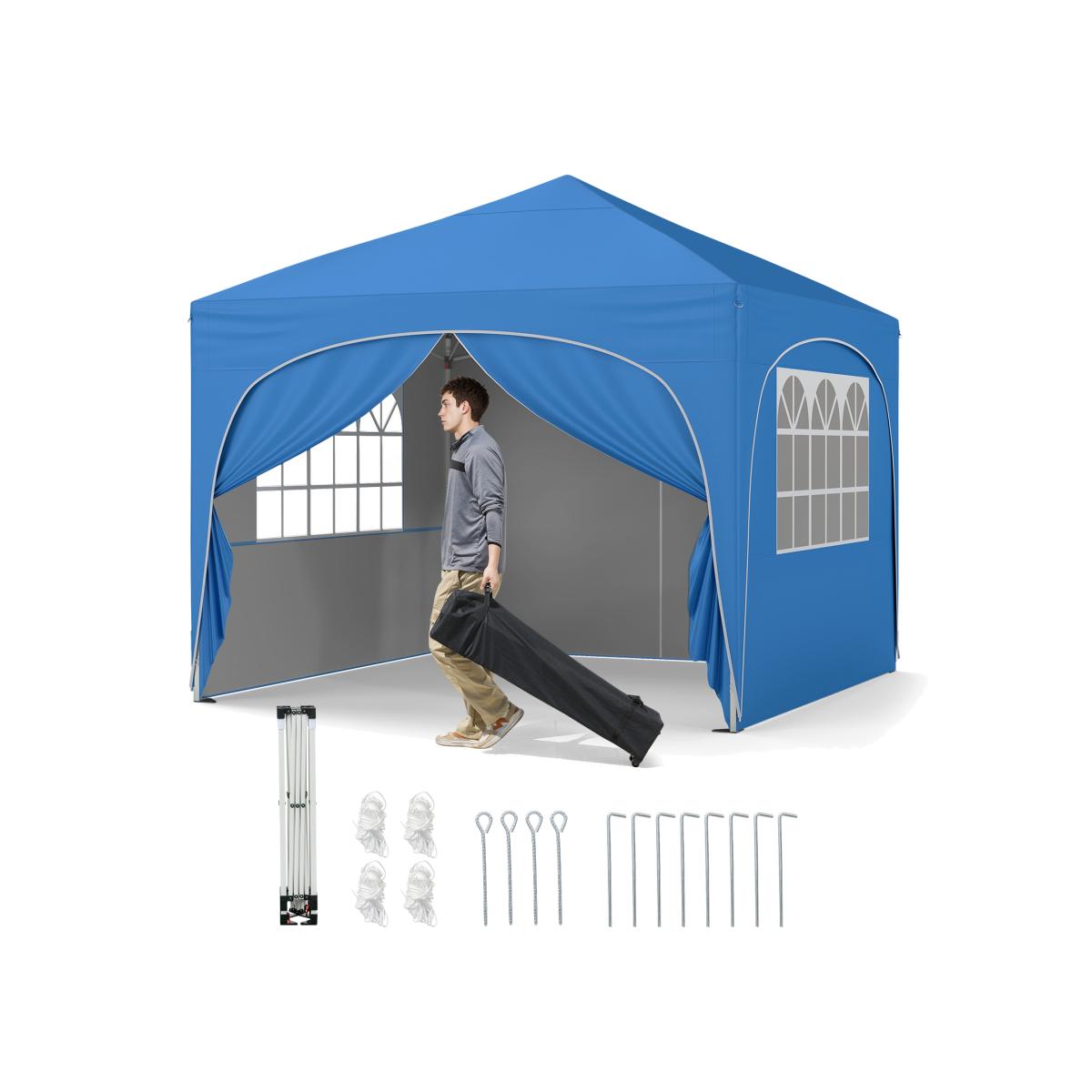 Provide a Reliable Shelter for Your Outdoor Adventures! Our portable and foldable canopy tent is equipped with a convenient pop-up structure, allowing you to set it up quickly without any tools, and it conveniently packs away into a wheeled storage bag for easy transport and storage. This spacious tent, measuring 300 x 300 cm (L x W) with 3 adjustable heights of up to 286 cm, features 2 zippered sidewalls and 2 sidewalls with windows, all detachable, creating a comfortable space for various outdoor activities, from commercial markets and exhibitions to family gatherings and recreational outings.