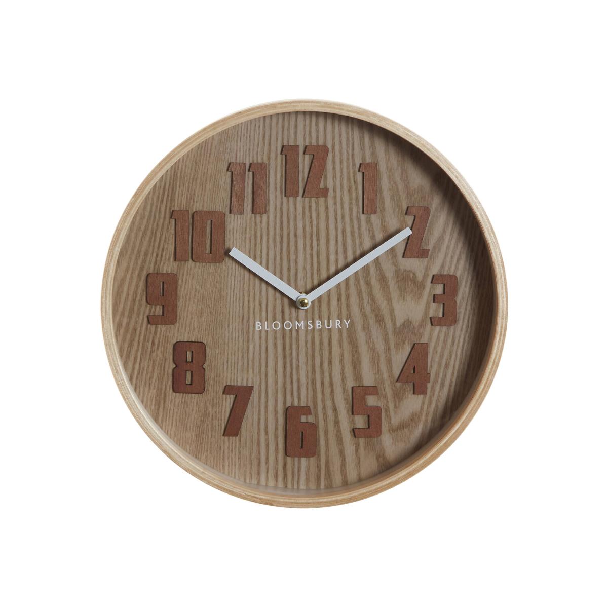 The round case is made from natural wood and has a light brown finish that blends in with the dial's darker tone. The large numbers are coloured brown and have an aesthetic that evokes 1970's chic. Its minimal white hands are easy to read. White text stating "Bloomsbury" is displayed beneath the hands, and a clear glass pane covers the dial. Product Dimensions:Diameter 30cm. This product will be dispatched by one of our trusted suppliers. You’ll be contacted by their selected courier about your delivery.