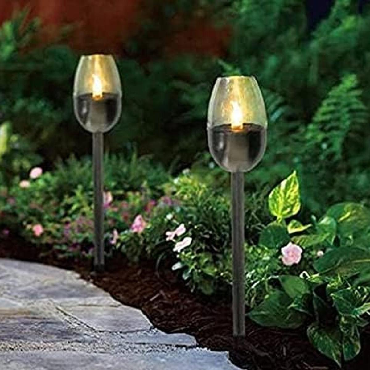 Illuminate your outdoor spaces with these solar-powered garden stake lights. Charging during the day, they automatically light up at night, providing a warm flickering flame effect. Crafted from stainless steel and plastic, they are waterproof and durable, making them ideal for pathways, driveways, patios, and gardens. Easy to install with no wiring required, these solar lights add a charming glow to your outdoor decor. Approx 30cm tall, includes 1 x 1.2V 100m. Ah battery 30Cm Solar Powered Flickering Flame Stake Light - Silver