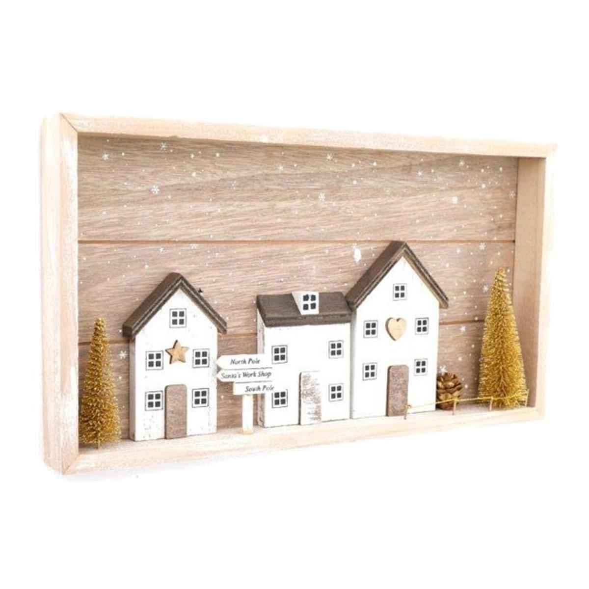 Accented with gold bottle brush trees and winter snow, this charming row of houses on a wooden wall plaque is an ideal way to infuse your surroundings with a dash of Christmas cheer over the festive season.