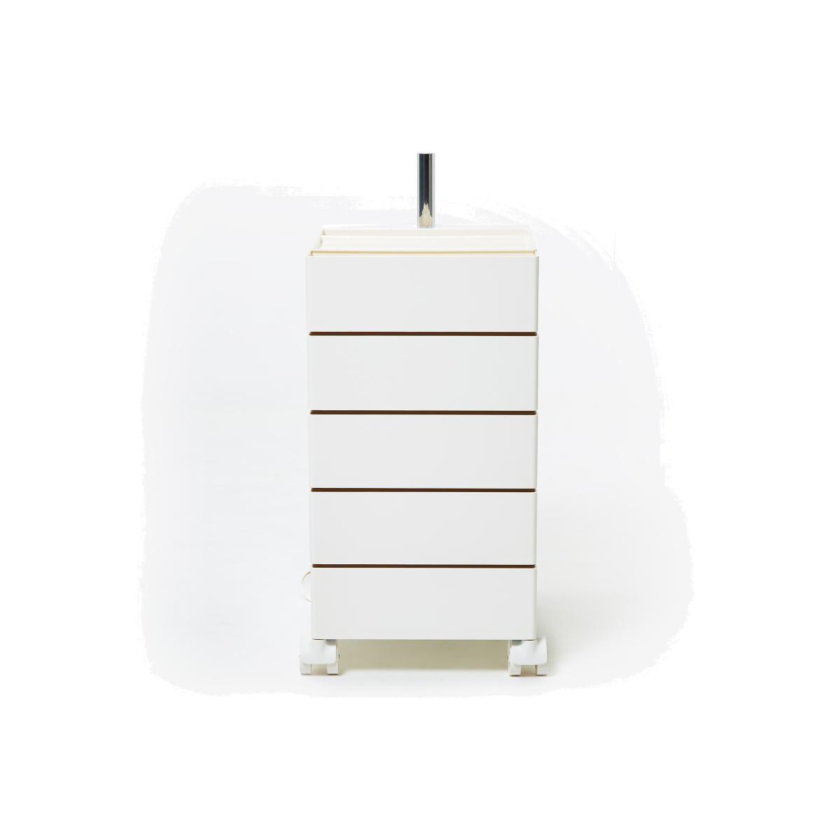 Designed by Konstantin Grcic for Magis, the white 360° 5-Drawer Unit is a playful storage accessory for those who create all over the house. Crafted from glossed plastic and grounded by an aluminium tube, each sleek drawer rotates 360 degrees, as per the product's name. Stationed on four wheels for easy transportation, each unit is stamped with the Magis logo as a mark of authenticity. A graduate of the Royal College of Art, award-winning German designer Grcic worked under Jasper Morrison before establishing his studio in Munich.