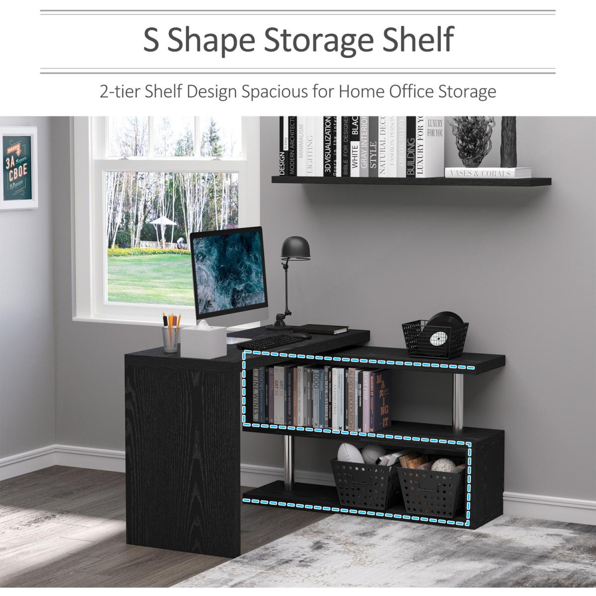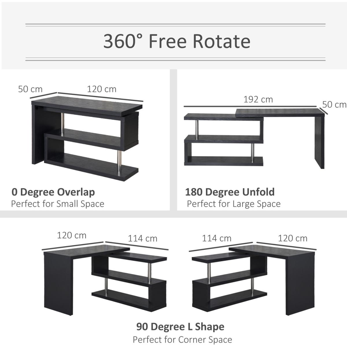 The HOMCOM L-shaped corner desk features an original 360 degrees rotating design that can be adjusted based on your selection. The modern look adds a touch of class to your home office. Desk is crafted from high grade materials. Multi-tier shelf provides lots of storage space. Create a stylish working station, storage unit, and display case in one with this unique piece from HOMCOM.