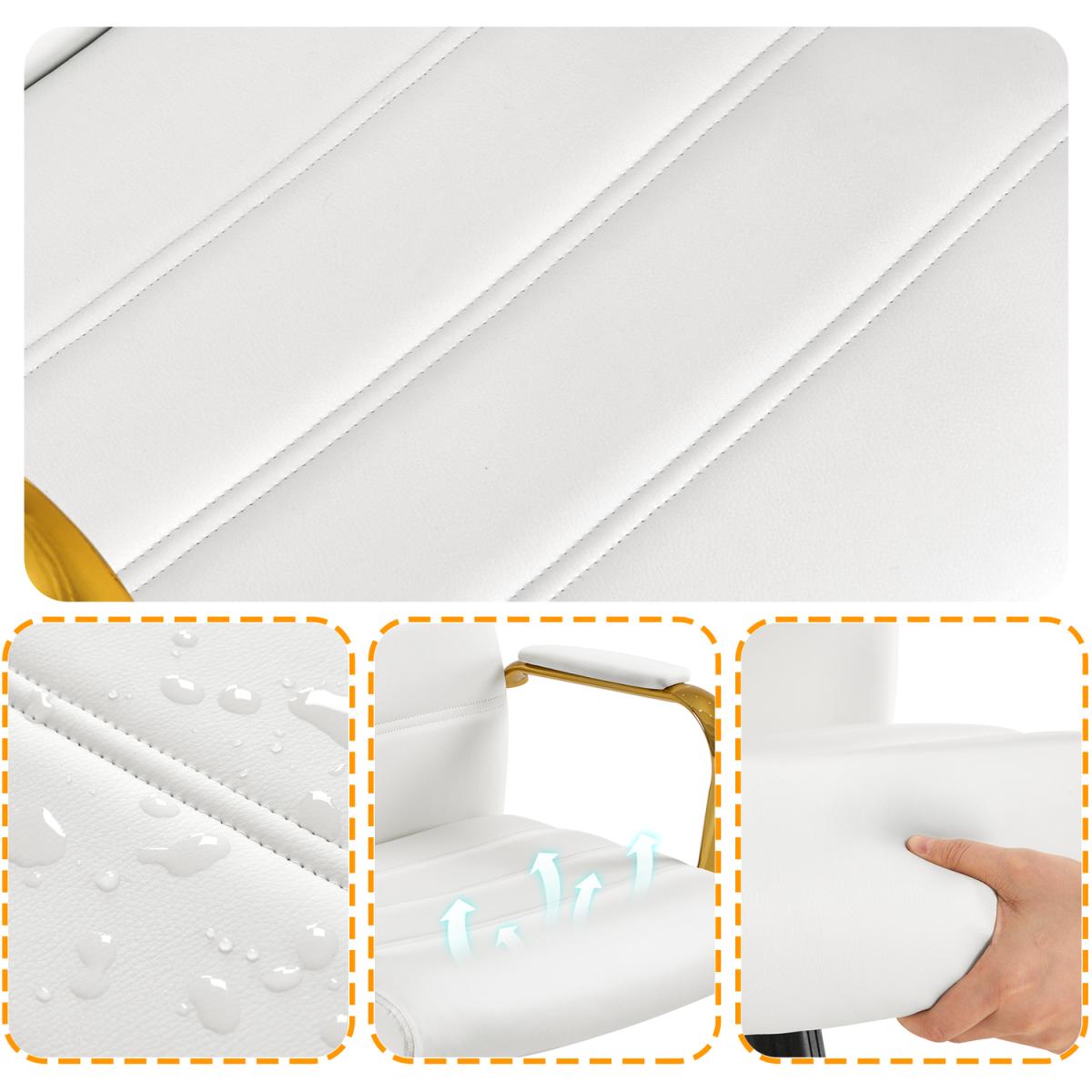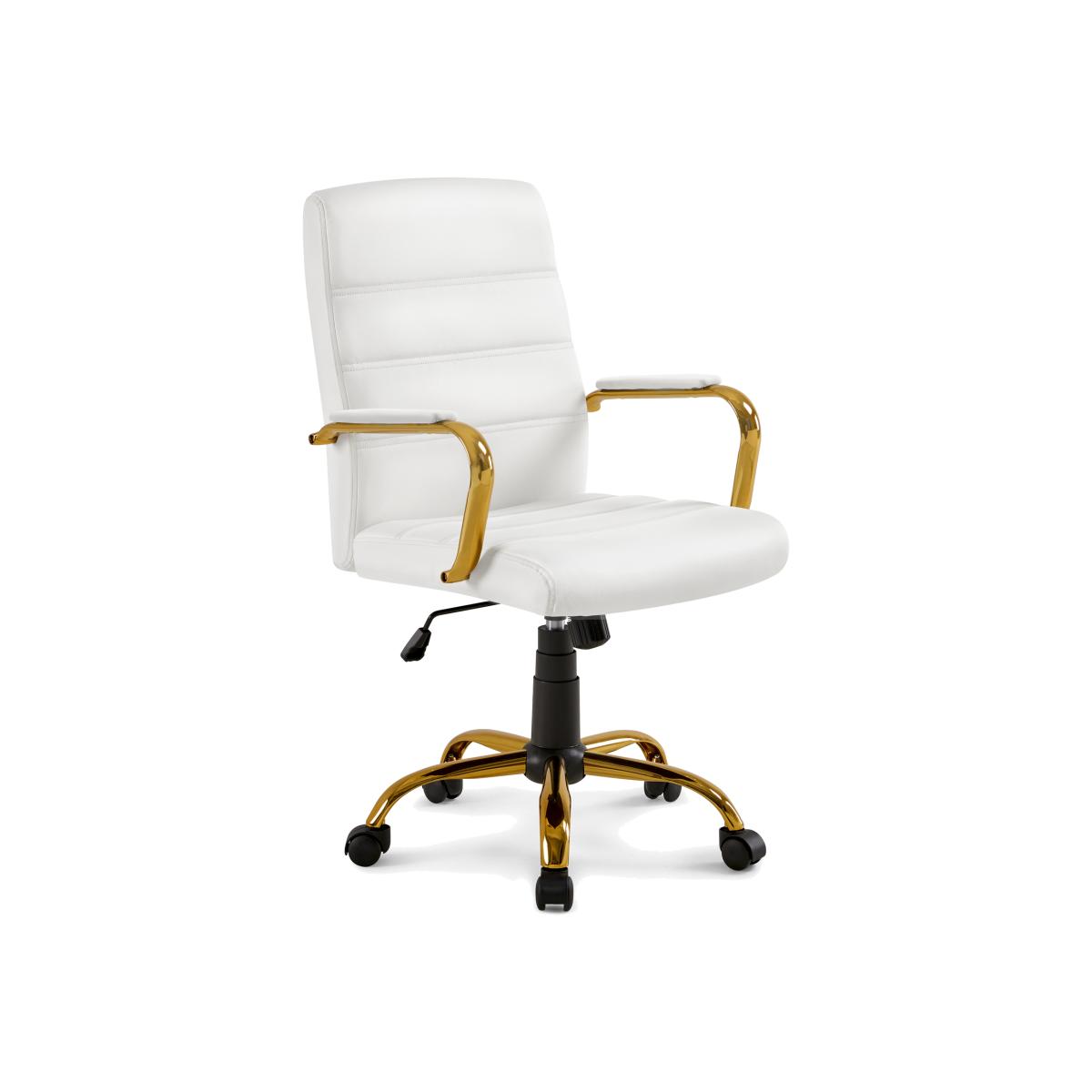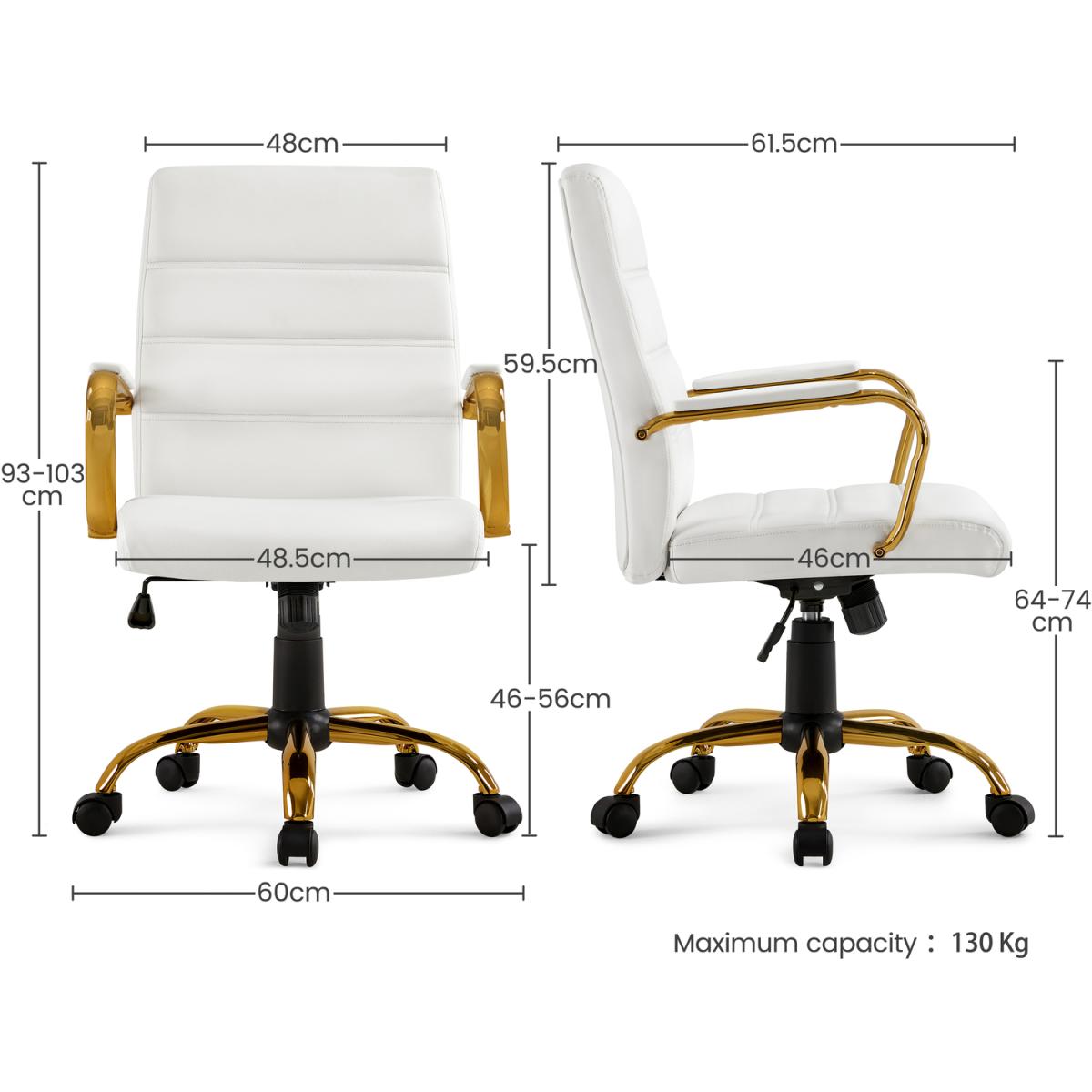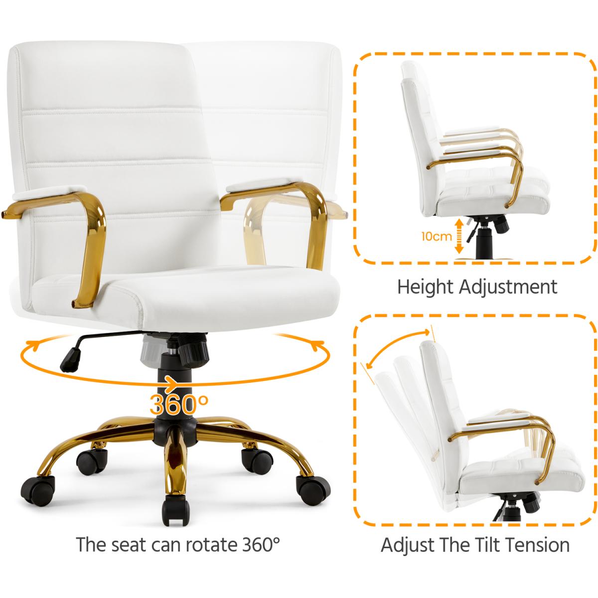 Believe it or not, a comfortable office chair is fundamental for a productive workday. A desk chair like this is ideal for a comfy sitting experience while also introducing an on-trend contemporary look. We apply quality PU leather upholstered fire retardant foam cushioning for the seat and back, and gold-tone chrome-plated steel for the arm and star base. Twisting and turning about is integral within the office and best optimal desk use. The 360 swivel seat and wheels of this mid-back office chair ensure must-have mobility. And with the tilt-lock mechanism and seat height adjustment, you can customize your seat to your preference.