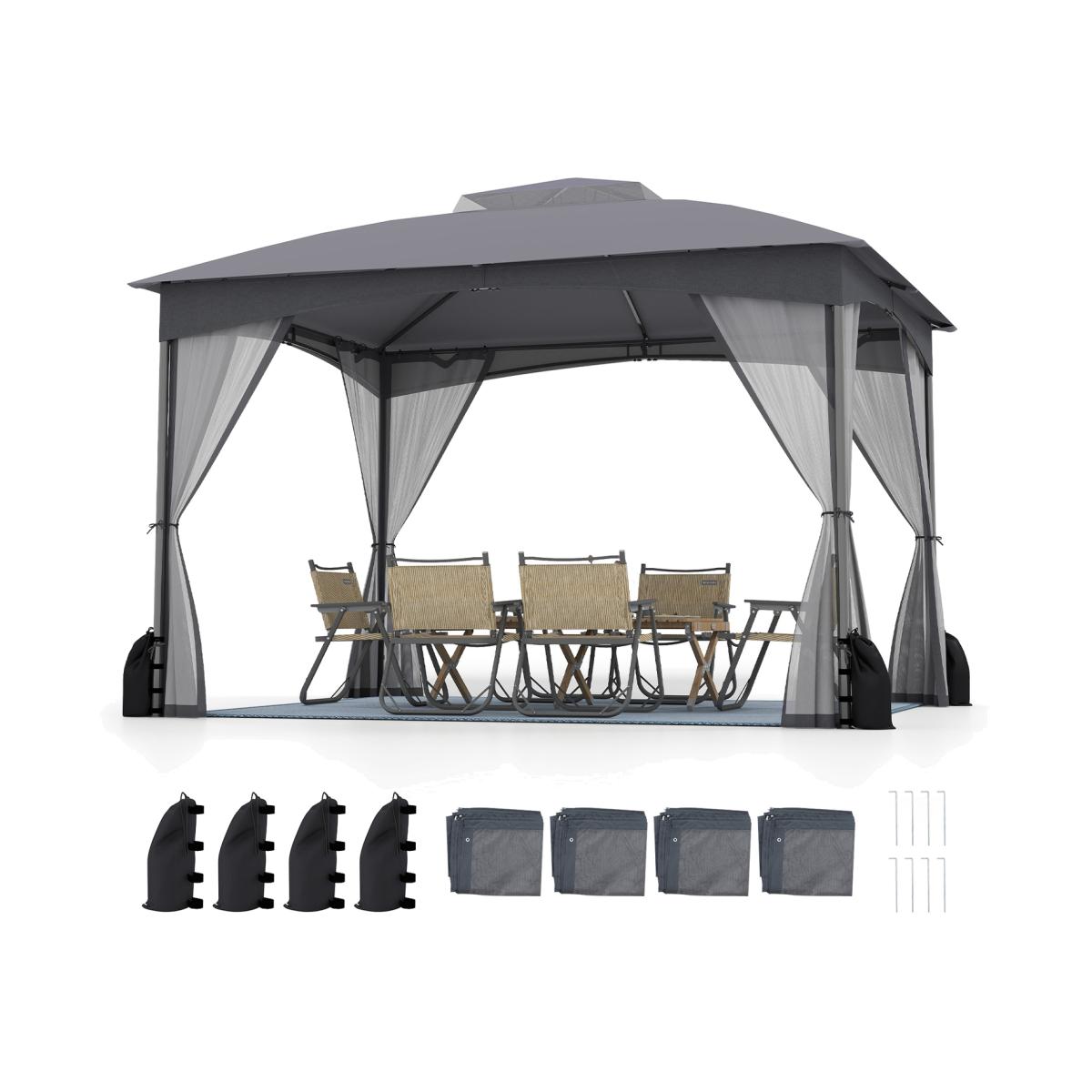 Embrace the relaxing oasis with the gazebo and netting. The outdoor gazebo measures 365 x 300 x 286 cm (L x W x H), creating an ample shaded space for a variety of outdoor activities including picnics, parties, and commercial events. It features mesh netting on 4 sides, which offer a panoramic view and keep unwanted guests out. The vented top is crafted with polyester fabric, which will shield you from harsh sunlight and light rain. Plus, the gazebo shelter adopts 2-section support poles that easily connect without the need of tools for easy assembly.
