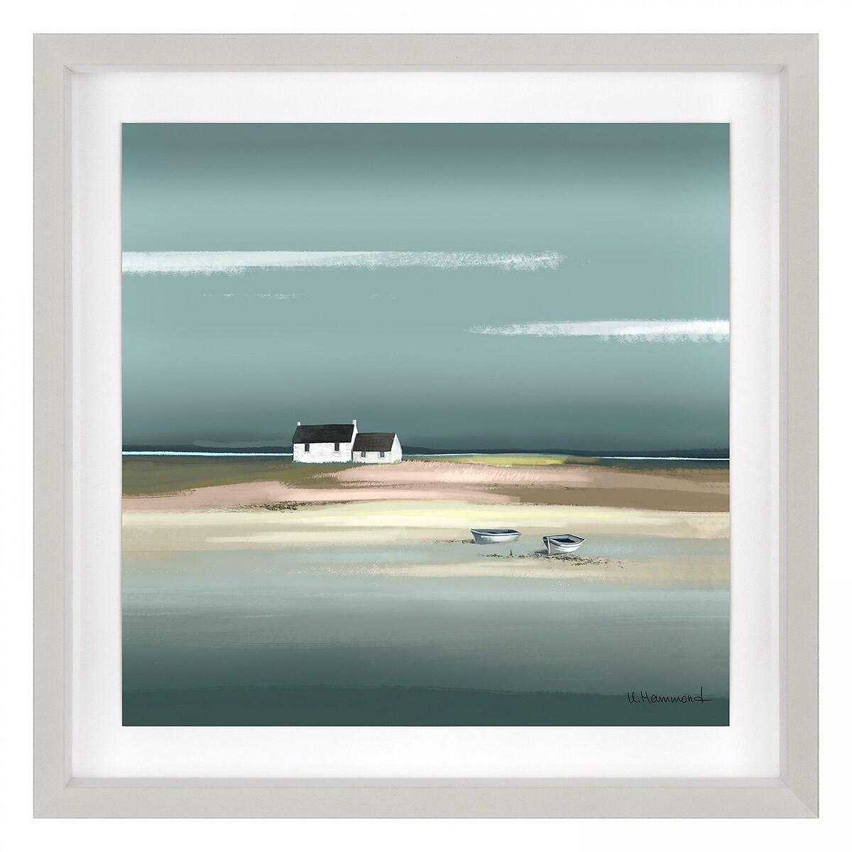 Two boats beached at low tide mimic the two high and dry cottages ashore in Ulyana Hammond's serene seascape with a cool, calm palette of greys, greens, earthy browns and salmon pinks. Raised image, framed and glazed. This product will be dispatched by one of our trusted suppliers. You’ll be contacted by their selected courier about your delivery. GALLE01