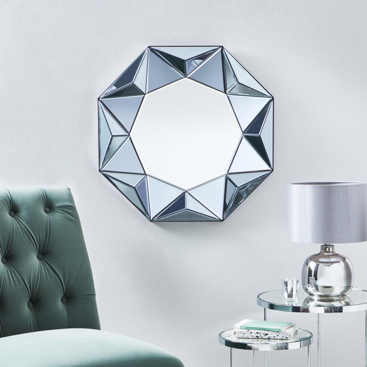 I love this mirror for its modern geometric design and versatile size. It works particularly well in contemporary or minimalist interiors, adding a touch of sophistication without overpowering the space. The smoked grey frame introduces a subtle colour contrast that can complement neutral palettes or bring depth to monochrome schemes. Practical styling tips include hanging it in a hallway for an eye-catching feature or above a console table to reflect light and create a sense of spaciousness. It pairs well with sleek metal accents and textured soft furnishings, making it a versatile addition to many interiors.