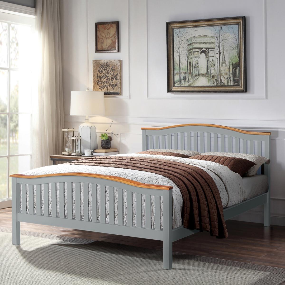 This comes in a choice of two colours either White with Caramel bar or Grey with Caramel bar. We also offer this curved style frame in a choice of three sizes, 3ft single, 4ft6 double or 5ft king-size. This frame is manufactured from solid pine in 2 different finishes, solid white and solid grey. The frame is of solid pine construction, with sturdy wooden slats for added comfort and support, with an open spindle headboard and foot board.