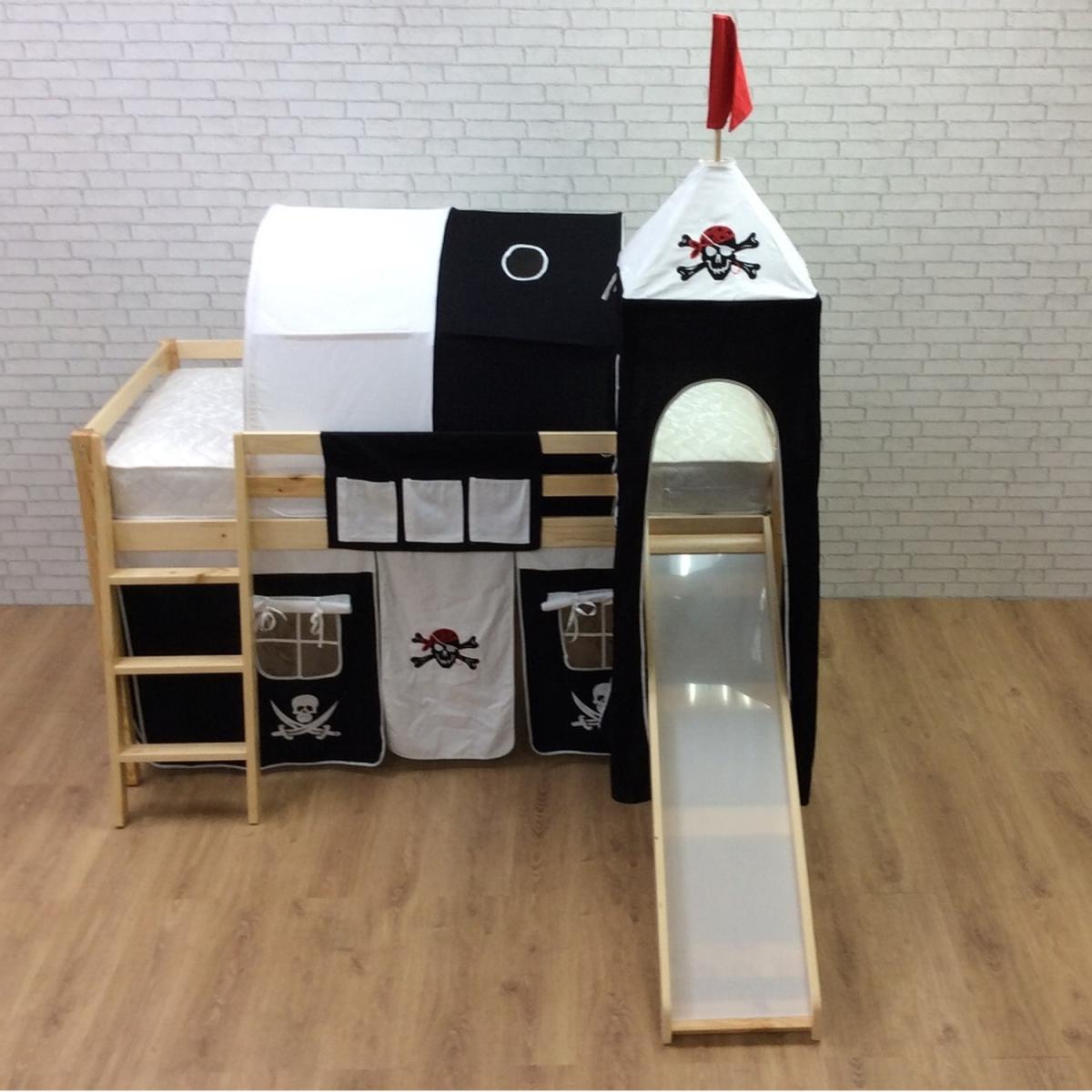 This 3ft single mid sleeper bed frame with slide is a great addition to any child's bedroom. It comes in either Pine or White and with the choice of either a pirate under bed tent or pink princess under bed tent.