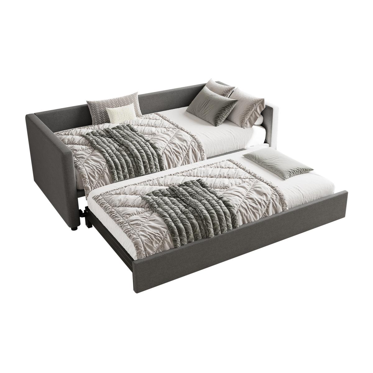 The upholstered 3FT single bed measures 90X19. 0 cm and features a pull-out bottom bed that can function as a standalone 90X19. 0 cm single bed or be combined with the top bed to create a spacious 180x190 cm double bed, making it perfect for accommodating guests or creating extra sleeping space. This daybed sofa bed offers a modern and sleek appearance with its grey linen upholstery,making it a stylish addition to any room while providing practical sleeping solutions for both adults and teenagers. Designed to optimize space,this bed is ideal for smaller rooms or apartments. The pull-out bed provides an easy way to maximize sleeping areas without taking up additional floor space when not in use. Crafted with high quality materials, the bed ensures durability and comfort. The linen upholstery is not only aesthetically pleasing but also adds a soft and cozy touch,ensuring a good nights sleep. This youth bed comes with straightforward assembly instructions, making it easy to set up. With minimal effort,you can have this functional and stylish piece ready to use in no time, perfect for busy households.