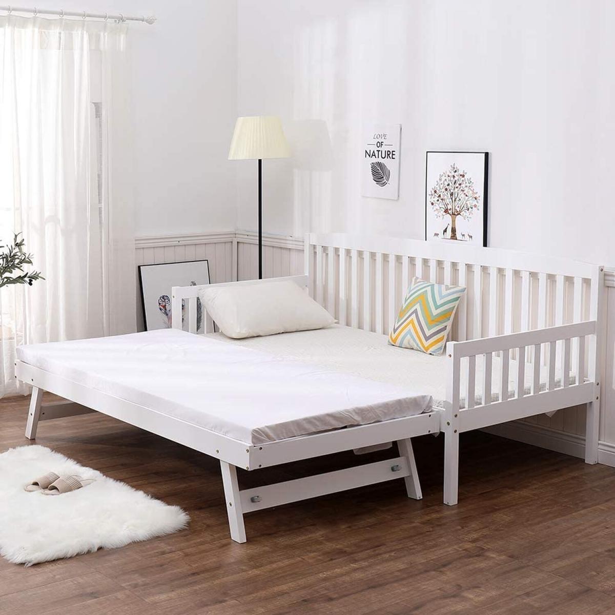 Kosy Koala 3ft Single Wood Daybed With Under Day Bed Guest Trundle with 2 Mattresses. Manufactured from a highly durable solid oak with a resistant lacquer to ensure long-lasting quality and aesthetic. Highly contemporary appearance featuring for a timeless appeal to look incredible in any bedroom setting. Very sturdy and heavy-duty bed suitable for both adults and kids. A sturdy solid slatted base provides maximum comfort whilst maintaining a healthy temperature control for a prolonged mattress life. A pull-out under-bed trundle can be raised to the same level as the daybed. The Underbed Trundle has 4 wheels to easily slide in and out under the bed. The 2 beds can be secured together using a screw to connect.