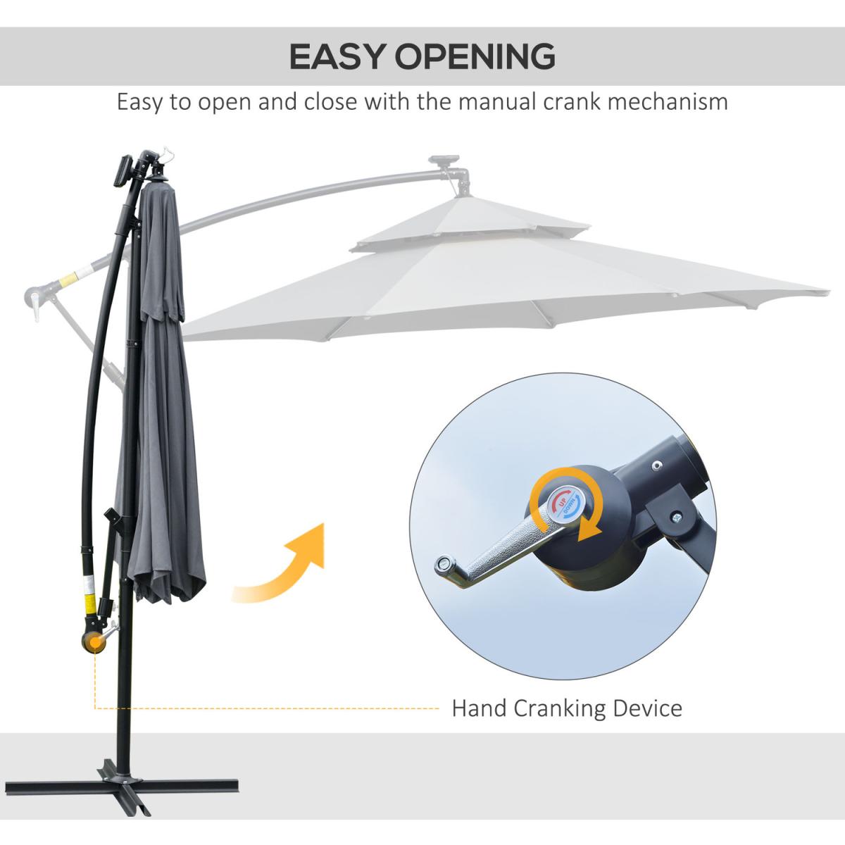 There's no better way to prolong the evenings this season: say hello to this Outsunny cantilever parasol with lights. A classic Cantilever design with a large overhanging parasol, it will create plenty of shade to keep your guests protected as they relax. Solar-powered LED lights are fitted underneath to illuminate your outdoor space at night - no using electricity. Use the crank handle to open the canopy and adjust to a position you want. Cross base included - use Outsunny weights to complete.