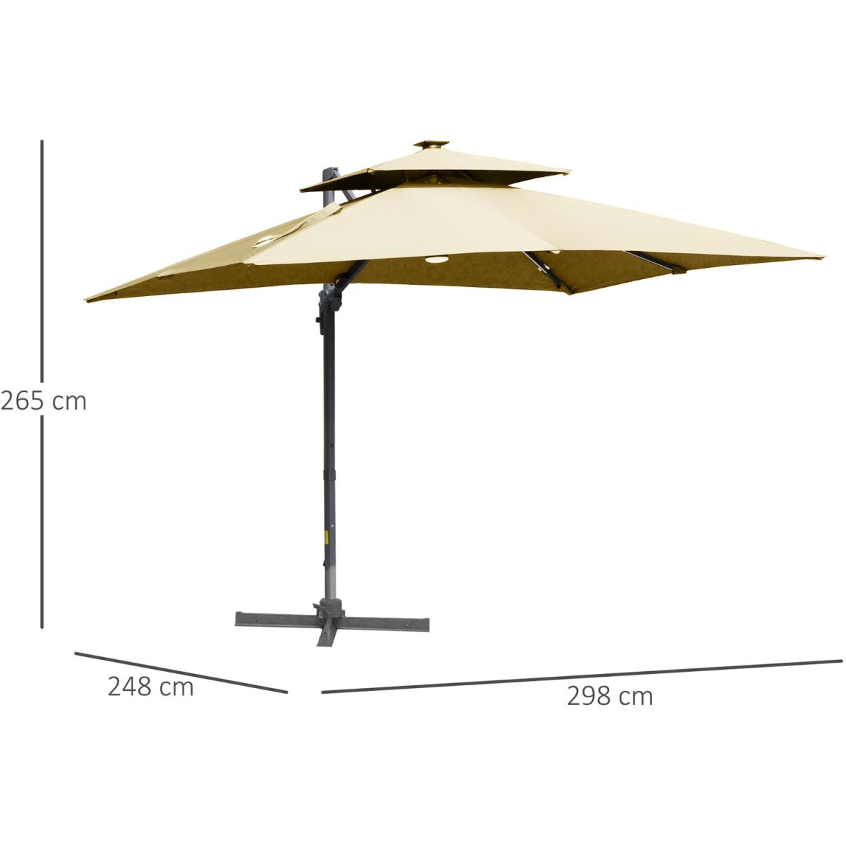 Keep yourself protected during day, enjoy a starry atmosphere at night with this Outsunny Cantilever parasol. A crank mechanism for effortless opening and closing, the square canopy both rotates a full 360degree and sets to four different angles so you're fully covered all day long. Solar powered lights on the ribs underneath light up the area at night for you and guests to enjoy outdoors even longer, without using any electricity. Complete with a power bank to charge electrical items close by.