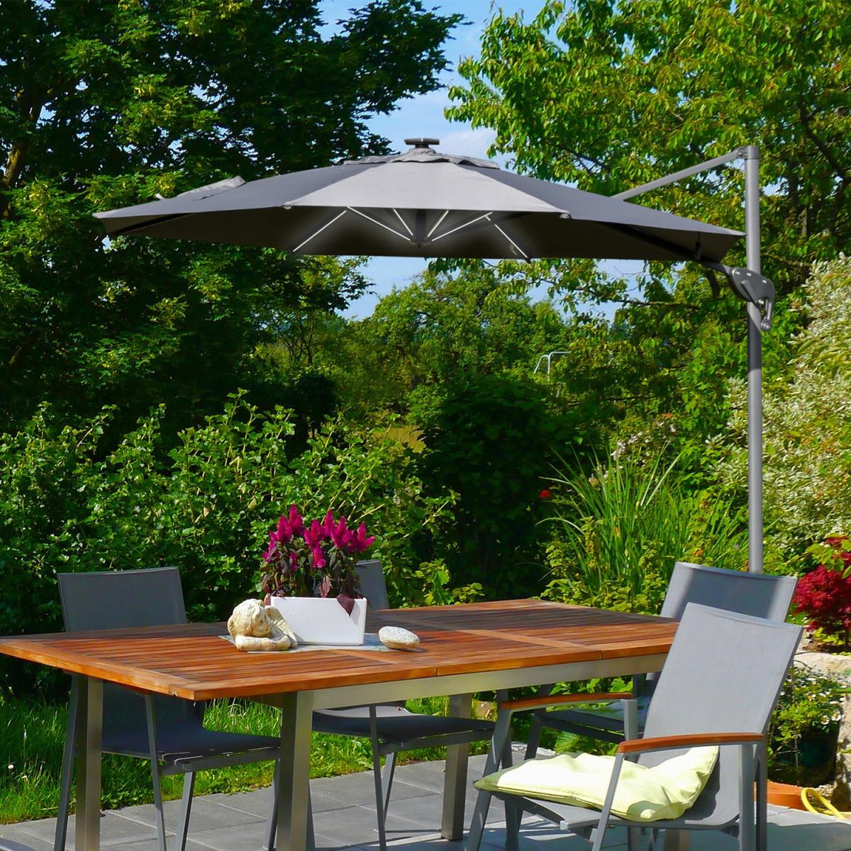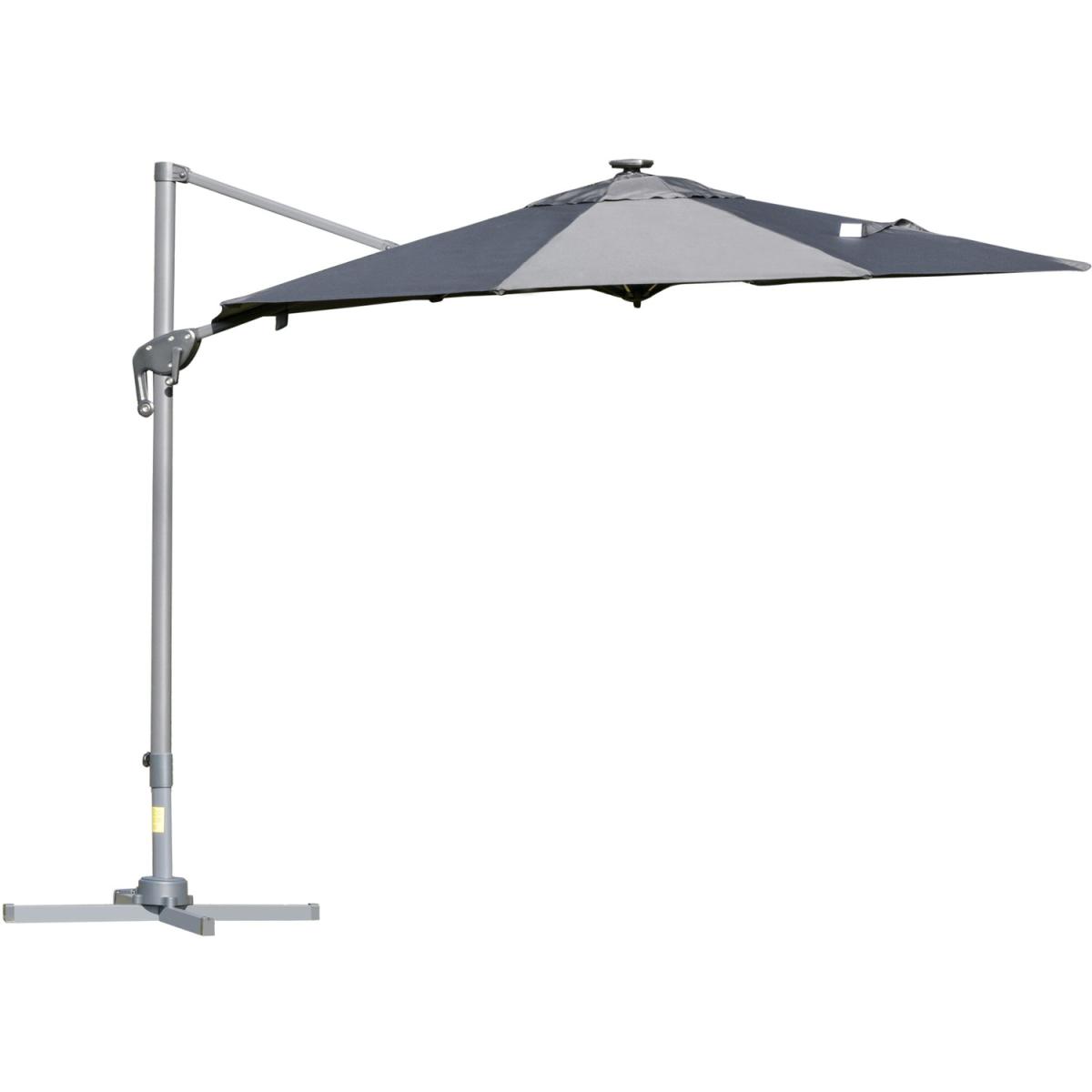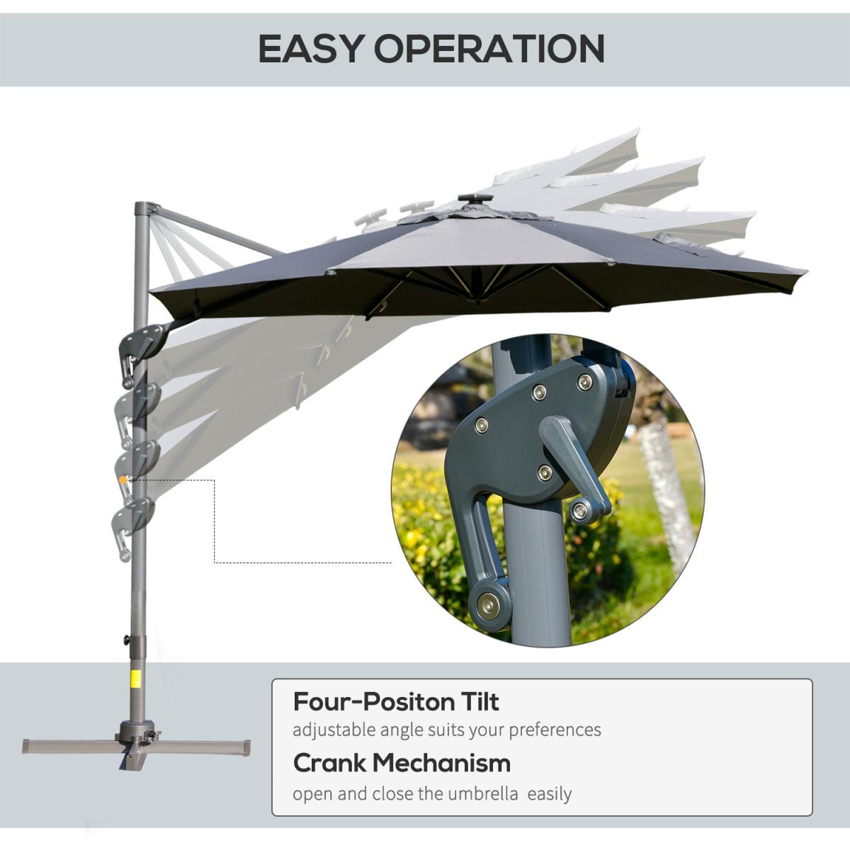 Bring a feeling of sitting underneath the stars at night at any time. This Cantilever parasol from Outsunny comes in an extra special design, as it features lights on the underside of the canopy. The LED lights are solar-powered, meaning there's no electricity required. The large canopy will keep you and your friends protected from direct sunlight, heat and light rain, it can be set to four different angles and spins around a full 360 degrees so you can find a position best for you. Finished with a crank handle to open and close. Evenings out in the garden have now been extended the beautiful way.