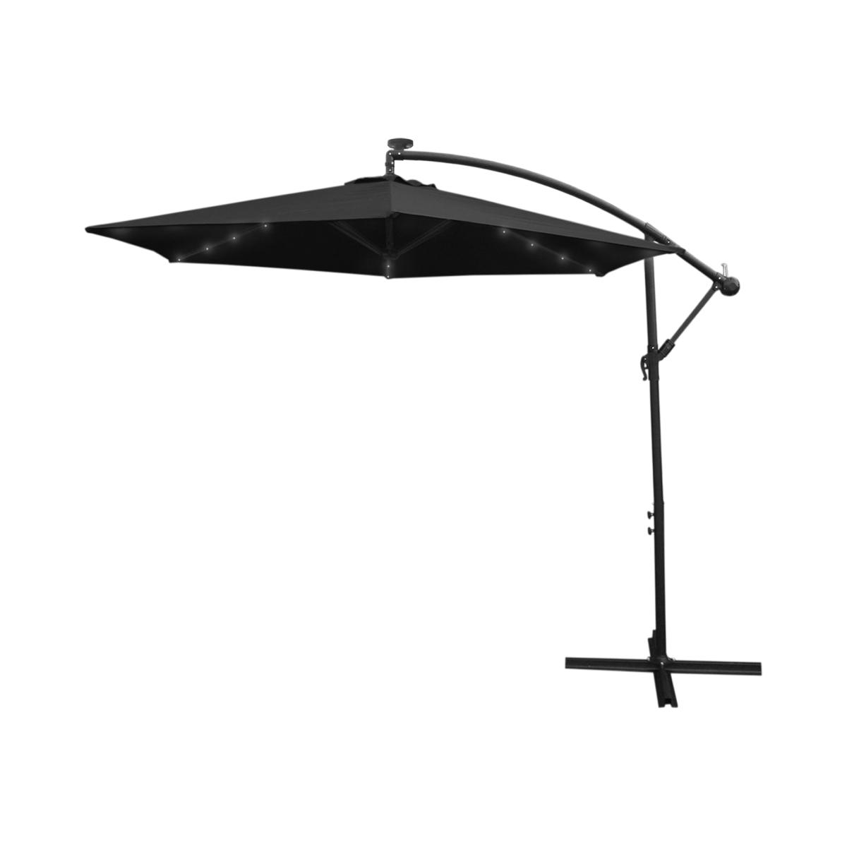 Get summer ready with this beautiful LED cantilever parasol. Stylish and practical this is a stunning addition to your garden whilst providing excellent UV protection with high-quality 160g polyester. Available in a range of modern colours including black beige cream grey and green this attractive parasol will complement any outdoor furniture. The crank winding mechanism means that you can have your parasol up in a flash to make the most of those sunny days. Then simply tilt to the perfect angle to give you the cover you need. Able to rotate a full 360 degrees it provides easy shading control throughout the day as the sun moves. The hanging style of this parasol keeps the stand out of the way allowing you to make the most of your shaded area. To keep things nice and cool there is a discreet vent at the top of the canopy which aids better airflow. This also helps with stability by reducing wind pressure. Each rib of the parasol is decorated with 4 beautiful cool white LED lights which are conveniently solar powered so when the sun goes down you can keep your summer evenings illuminated in an environmentally and financially friendly way. With a built-in on-off switch, you can quickly light up your parasol to continue enjoying your outdoor spaces. Made from durable powder-coated carbon steel and with a pole thickness of 48mm this parasol is extremely sturdy and is sure to stand the test of time. For some added protection we have included a waterproof rain cover to keep your parasol in tip-top condition all year round. A cross-section bottom allows the cantilever to stand freely but to ensure it is securely anchored it is best paired with suitable base weights. Shade from the sun or take the party right through to the night with the magical LED lights. This Cantilever parasol with 24 LED lights is the perfect accompaniment for every setting.