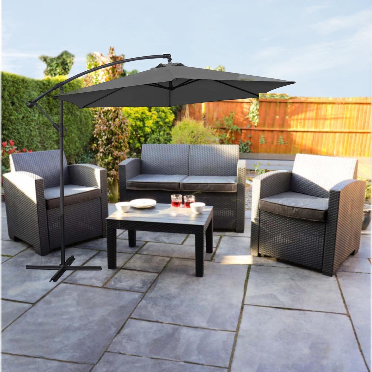 Impress your friends and neighbours with this Contemporary designer large 3 metre banana parasol. Make the most of your garden and enjoy it this season with one of our parasols, providing 3m of shade it is perfect for sheltering your outdoor furniture and allowing you to enjoy the weather. Complete with metal stand and frame, we do recommend the parasol be weighted down with either parasol weights ( not included ) or fixed to the floor by the cross feet. To open and close the parasol you simply wind the handle, some small assembly of the base is required.