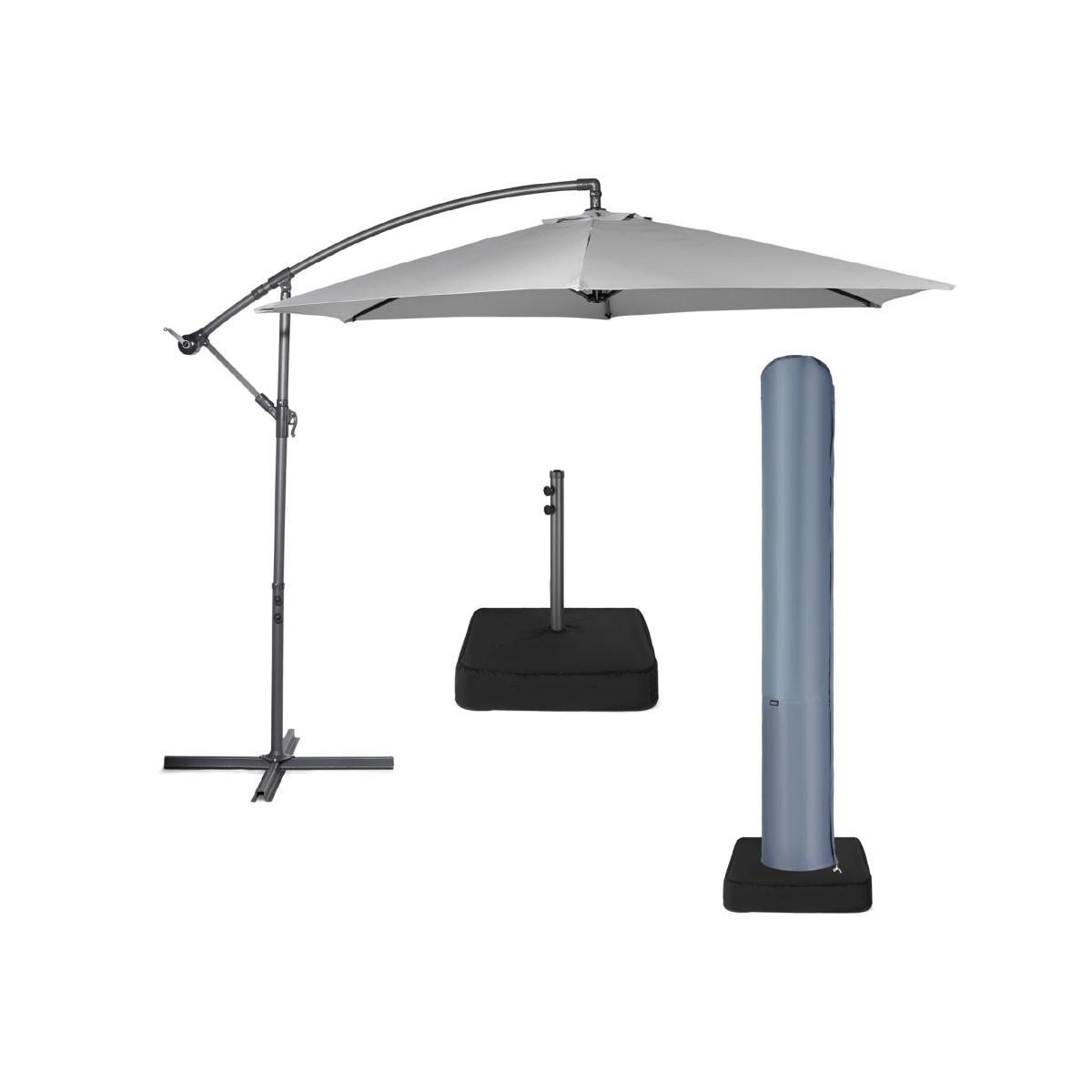 Introducing the Von Haus standalone parasol with base and cover, all you need for shaded relaxation. First up in this triple threat is the banana parasol, finished in a contemporary grey colourway to complement any garden. Fitted with tilt, rotate, and hand crank functions, say hello to simple shade. Ensure your parasol is securely positioned whatever the weather with the heavy duty base, featuring a sturdy X-frame structure and 310. D Oxford fabric casing. The wide 25cm opening offers ample room to fill the base with up to 40kg of sand, soil, or stones, without any spills! When not in use, place the waterproof cover over your parasol using the telescopic pole. With an elastic drawstring and zip fastening, the cover ensures a secure fit, offering complete protection against the elements.