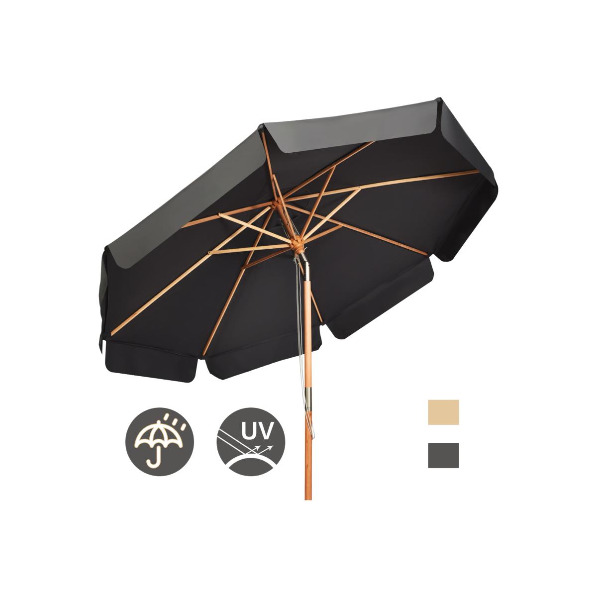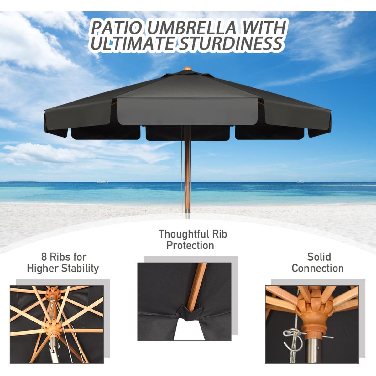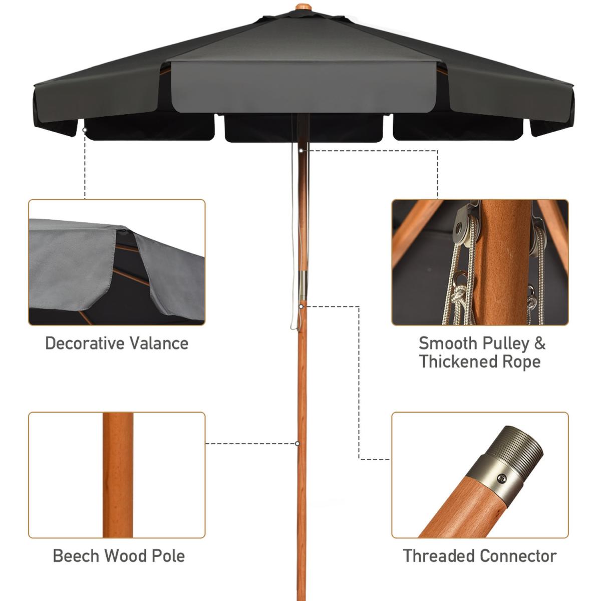 Are you still bothered by the harsh sunshine outside when you enjoy the outdoor lounge time? Our tilt patio umbrella is effective at blocking the sun thanks to premium polyester fabric. It also shows great performance in fade resistance to provide years of elegance. You don't need to worry about the assembly since it is fairly easy without requirement of any tool. Furthermore, overall structure consists of solid beech wood pole and 8 whitey wood ribs remains strikingly stable as you want. The tilt mechanism brings much more convenience in adjusting the Angle of canopy according to the sun direction. And thus let you enjoy all-day outdoor sun shade.