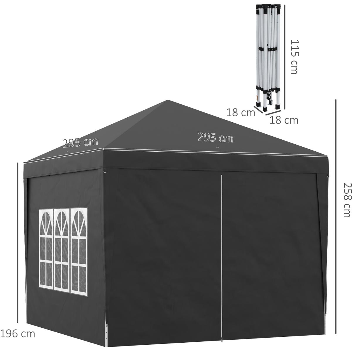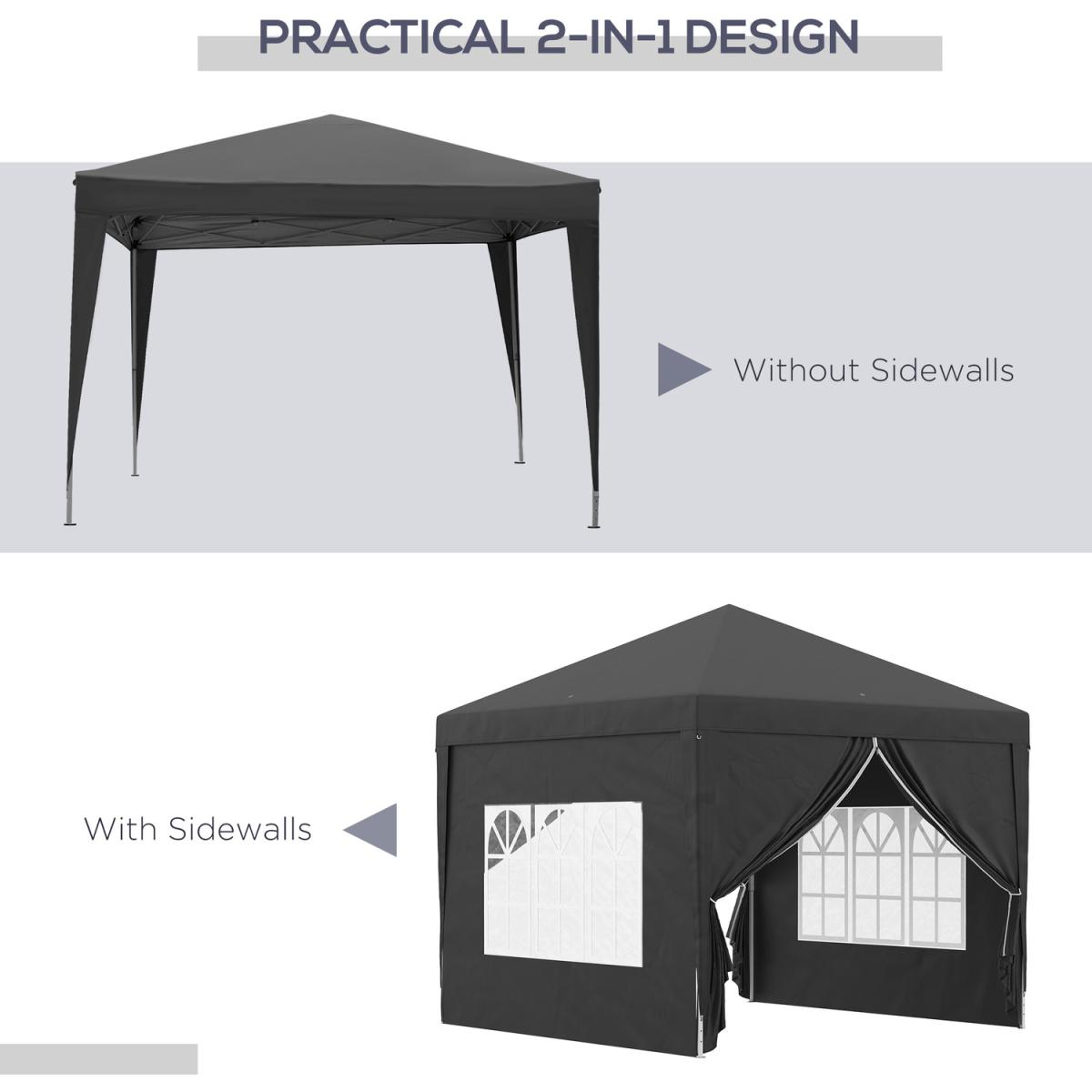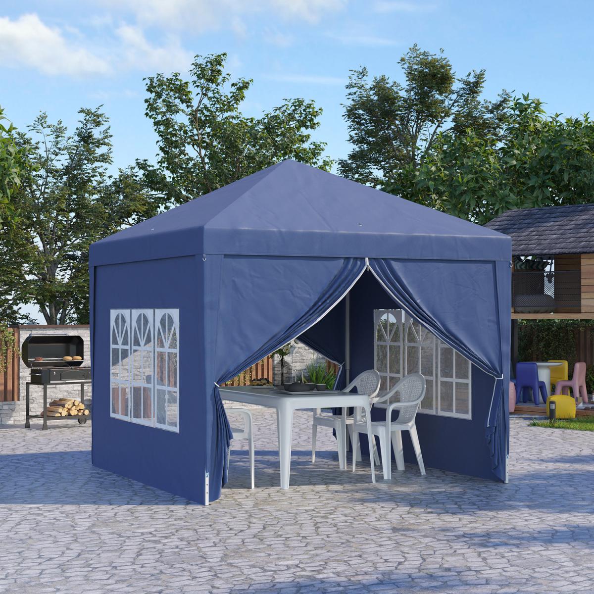 This Outsunny 2.95 x 2.95m gazebo with sides is a great, no-fuss outdoor shelter. It is ideal for family parties, weddings, picnics, sports events, outdoor vendors, craft fairs, job sites and camping trips. The pop-up design makes set-up and take down super easy. It comes with two removable walls: create an open or closed feel, whenever. The powder-coated steel frame means a strong standing structure. Comes with guy ropes and ground stakes to pin to the ground for extra stability.