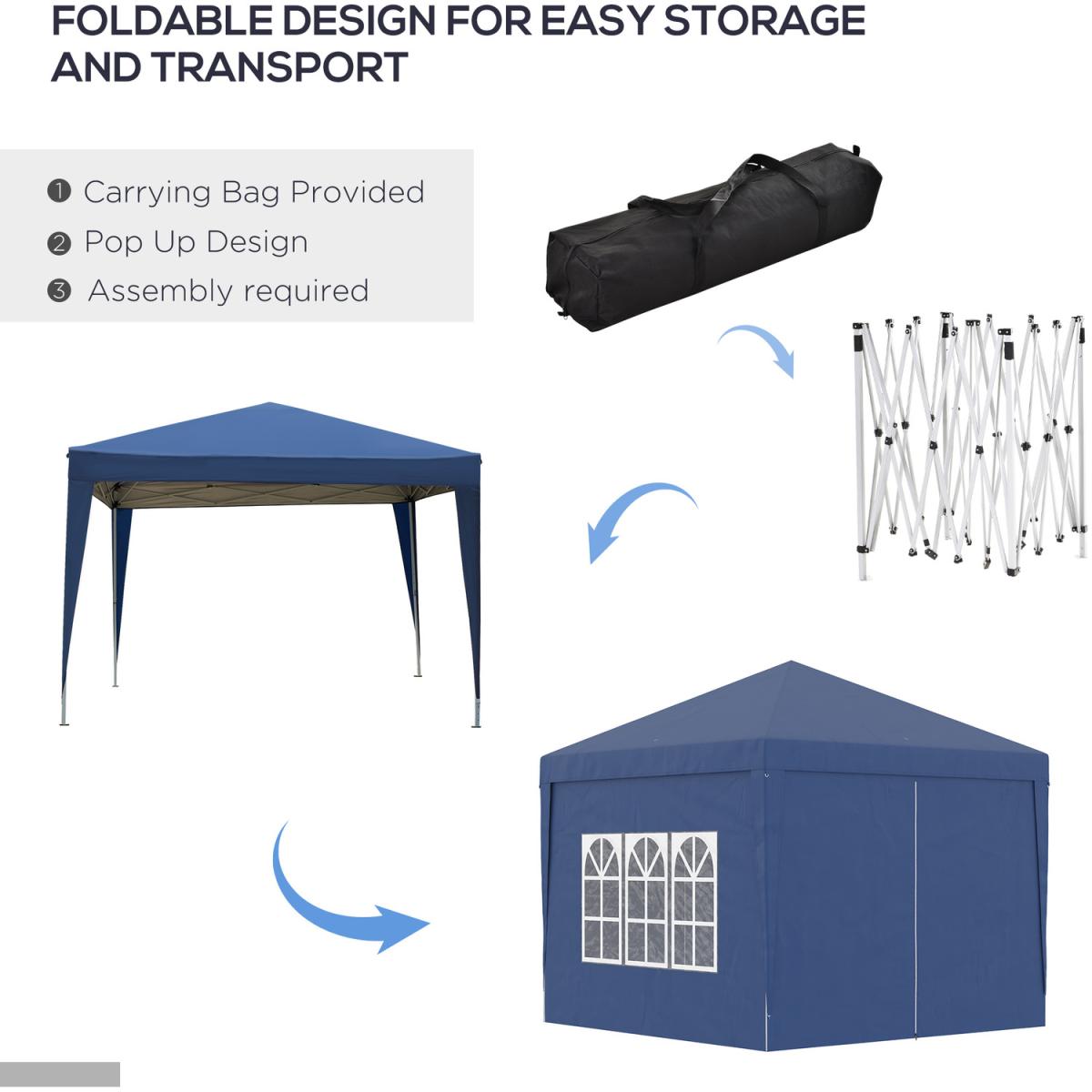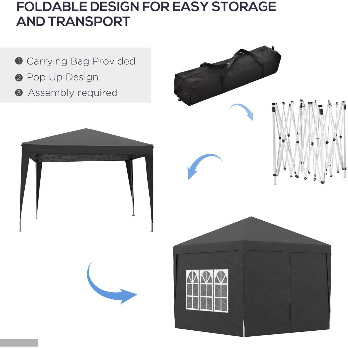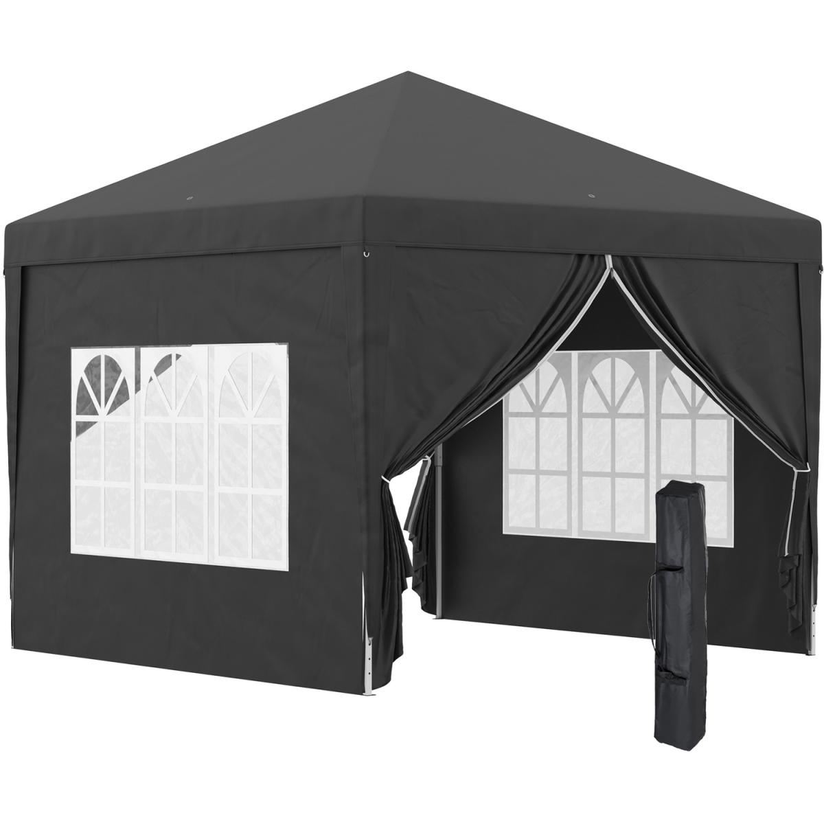 This Outsunny 2.95 x 2.95m gazebo with sides is a great, no-fuss outdoor shelter. It is ideal for family parties, weddings, picnics, sports events, outdoor vendors, craft fairs, job sites and camping trips. The pop-up design makes set-up and take down super easy. It comes with two removable walls: create an open or closed feel, whenever. The powder-coated steel frame means a strong standing structure. Comes with guy ropes and ground stakes to pin to the ground for extra stability.