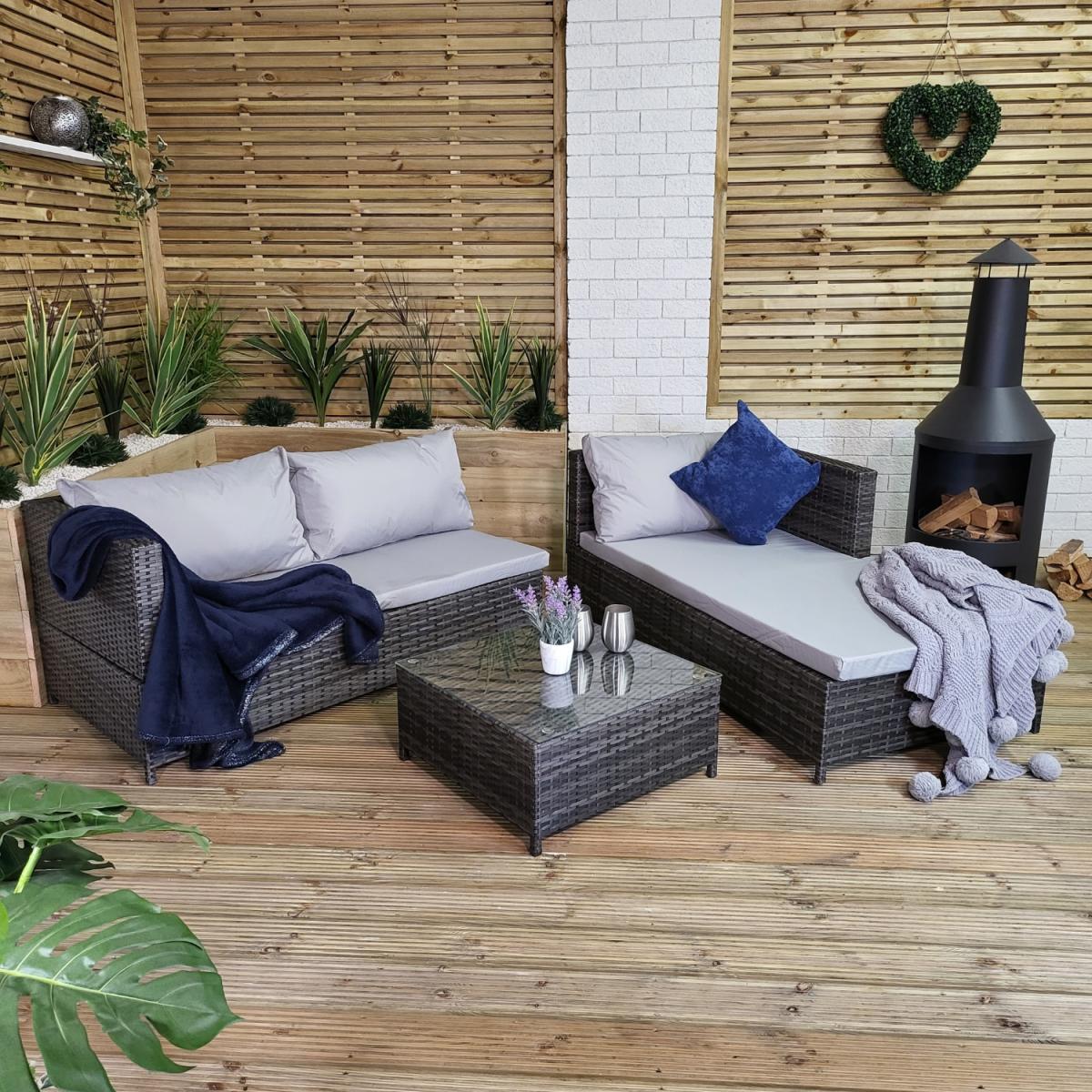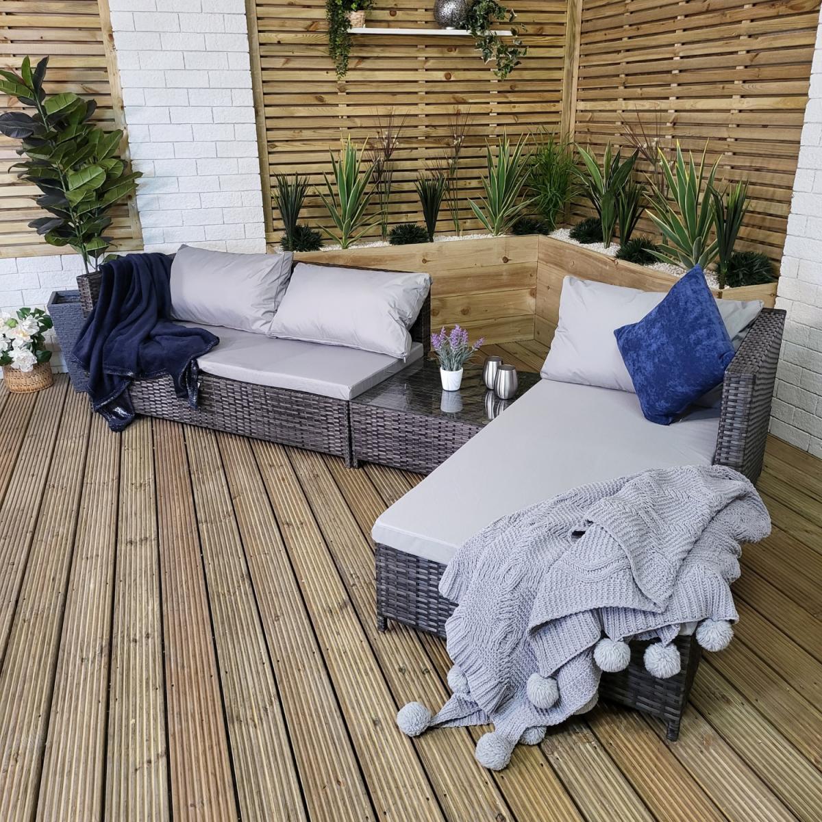 Brighten your backyard or garden with this modular garden sofa set that can be positioned to suit the occasion. With multiple comfortable options available, this rattan cube garden furniture is great for lounging or sunbathing in the sun. The glass coffee table is perfect for drinks and other items. The outdoor sofa bed provides comfortable seating positions, including grey cushions to create the perfect lounge set. Lie back and relax on the daybed or talk with friends over a nice drink on the sofa table patio set. Can be used as a garden set, patio furniture or as an easy balcony table and sofa. The provided instructions make the rattan sofa easy to setup and maintain for many years.