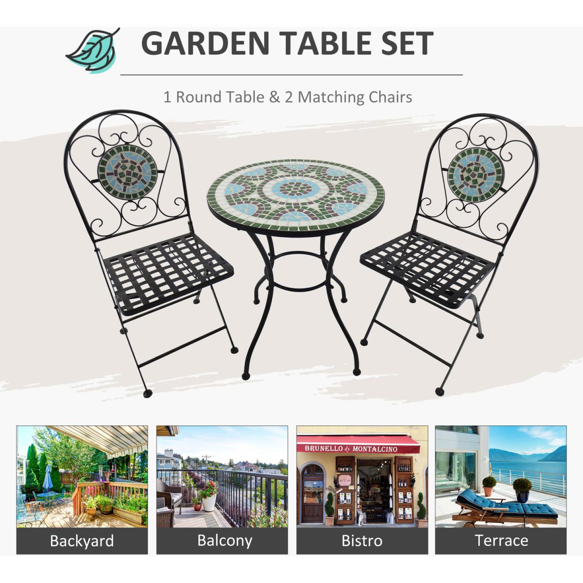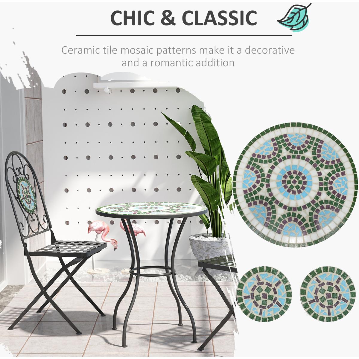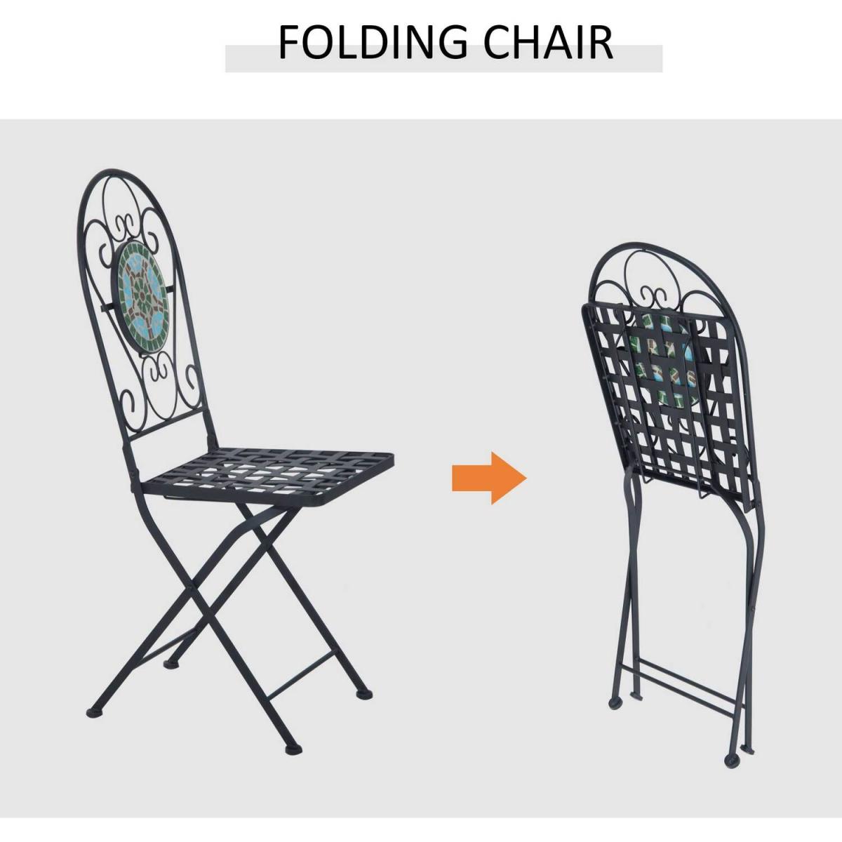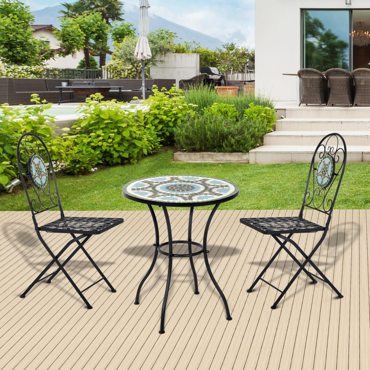 This Outsunny bistro set and a great addition to any garden, the set includes 2 chairs and a table. The main feature of this set is the mosaic design on the table and the back of the chairs, the chairs can also fold for easy storage when not in use. The set is made from Metal with Mosaic tiles to make the design stylish and elegant. It provides a great look to any garden or patio and would also accompany any other furniture.