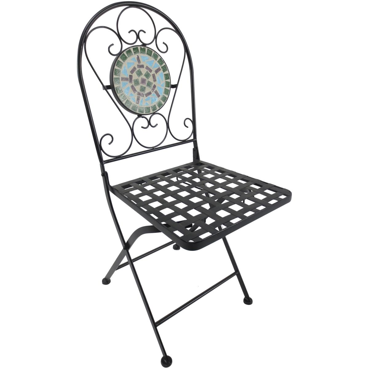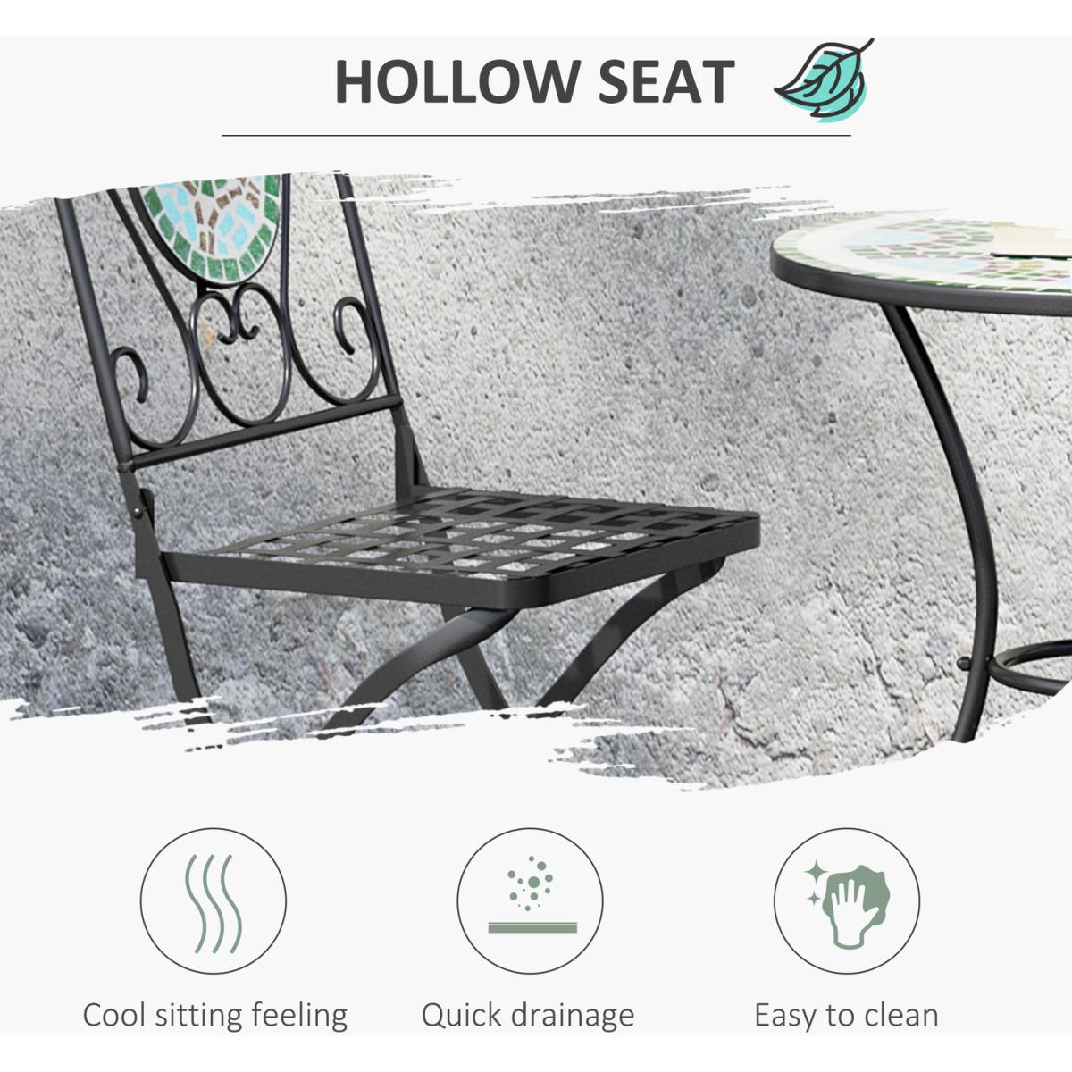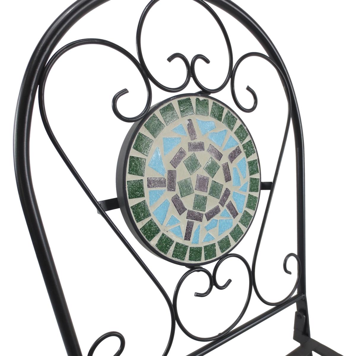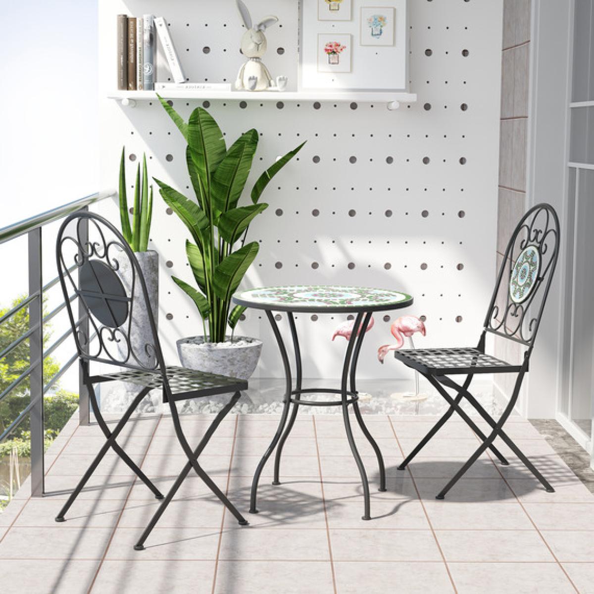 This Outsunny bistro set and a great addition to any garden, the set includes 2 chairs and a table. The main feature of this set is the mosaic design on the table and the back of the chairs, the chairs can also fold for easy storage when not in use. The set is made from Metal with Mosaic tiles to make the design stylish and elegant. It provides a great look to any garden or patio and would also accompany any other furniture.