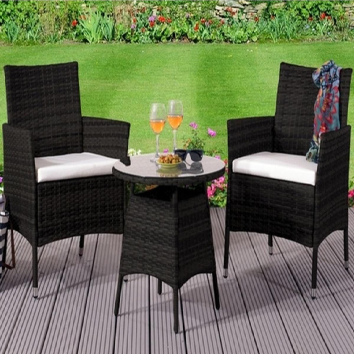 Featuring a contemporary design with gently curving edges, this bistro set makes a great addition to your patio, garden or conservatory for entertaining guests or enjoying your morning coffee in comfort. This set includes two comfortable armchairs with padded cushions and gently curving backrests for comfortable support and a coffee table with a round tempered glass top and curved interwoven frame finish. The natural coloured seat cushions are designed to resist the elements with showerproof covers that are removable and machine washable. Made from high-quality poly-rattan material which is UV resistant to prevent colour fading and woven over a sturdy steel metal frame to provide durability over the years and requires no maintenance. The dining table features a scratch-resistant tempered glass top for safety and resilience. Please be advised that all dimensions are approximate, please allow room for slight variations.
