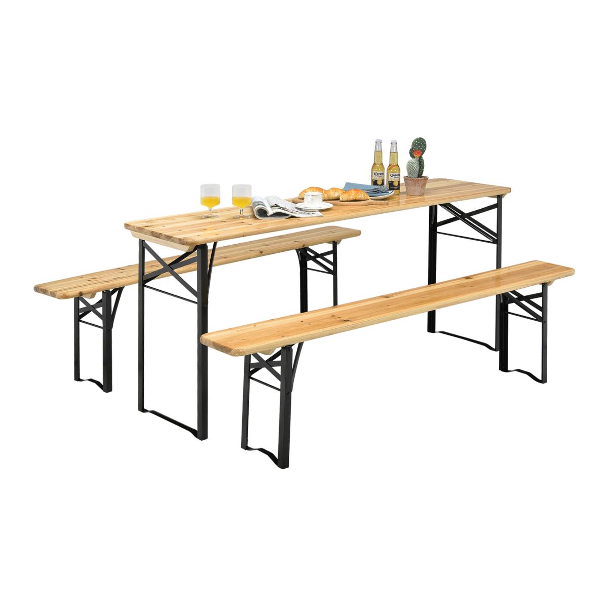 This 3-piece folding picnic table and bench set is perfect for outdoor activities! With the folding and portable design, this table and bench set can be easily set up or folded down, and be taken to various outdoor activities, like BBQ, lawn parties, picnics, etc. Also, the folded size is space-saving and convenient for storage. Besides, the beer table and benches feature high-class fir wood and sturdy steel frame, providing durability and stability for the patio use. More than that, this table bench set works great for the indoors. You can place them in the kitchen, dining room, office, garage and so on. And owing to the waterproof surface, the table and benches can be cleaned with ease and are suitable for daily use. Furthermore, this set of table and benches is sent in fully assembled, which saves your assembly time.