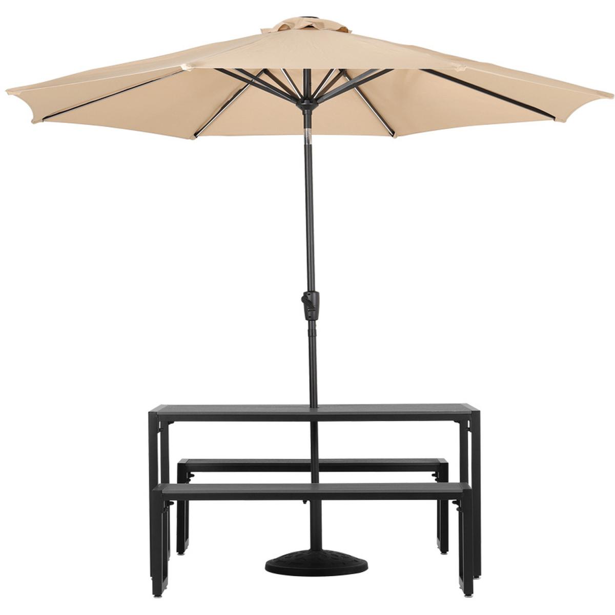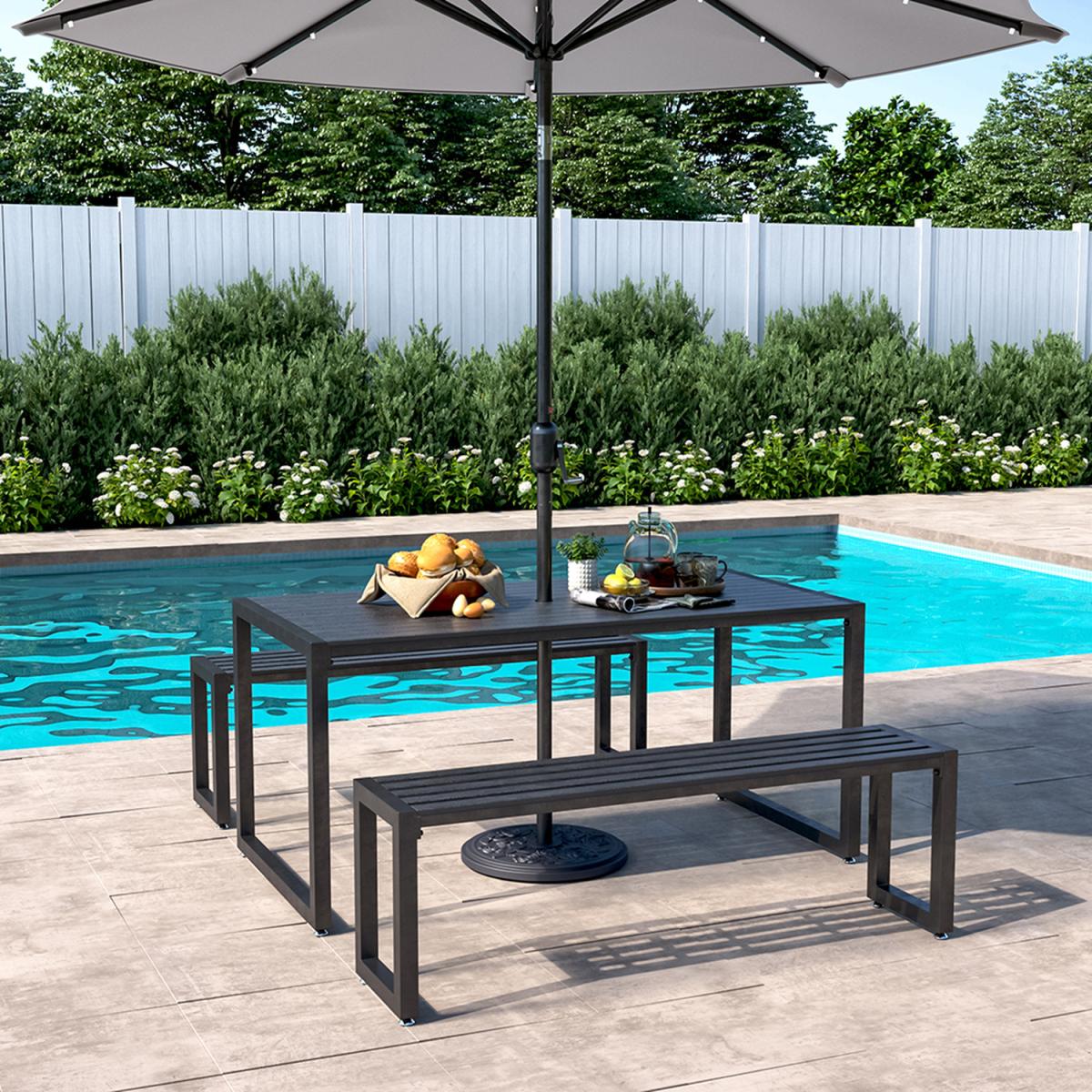 Enjoy the outdoors in style and give your ensemble a refresh when you add this three-piece dining set. With a design that would look right at home on a city or suburban deck, this set is a must-have for your alfresco space. The clean-lined and simplistic silhouette of this three-piece set imbues it with contemporary appeal, while the planked table and seat top anchor it with a traditional touch. Include one table and two benches.
