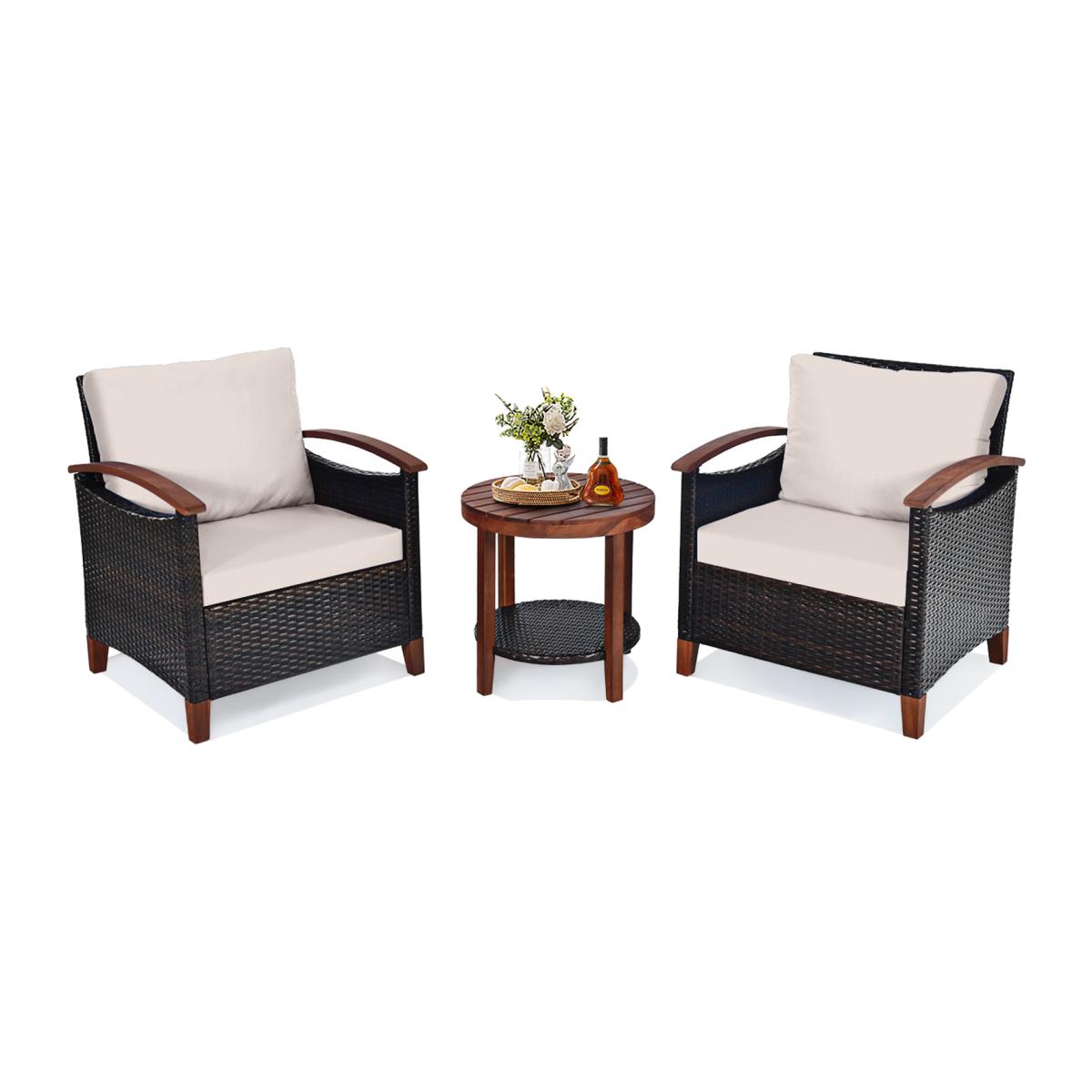 Our 3pcs rattan chair set is your ideal choice. It is made of high-quality rattan and a metal frame, which is solid and durable for outdoor use. And the wooden tabletop is easy to clean and the bottom shelf provides additional space to hold your items. Besides, the seats come with soft cushions which are filled with high-density sponges to bring you a comfortable experience. The classical and natural appearance makes this furniture set suitable for your patio, garden and backyard. 3. Pcs Rattan Chair Set Patio Conversation Set - Brown